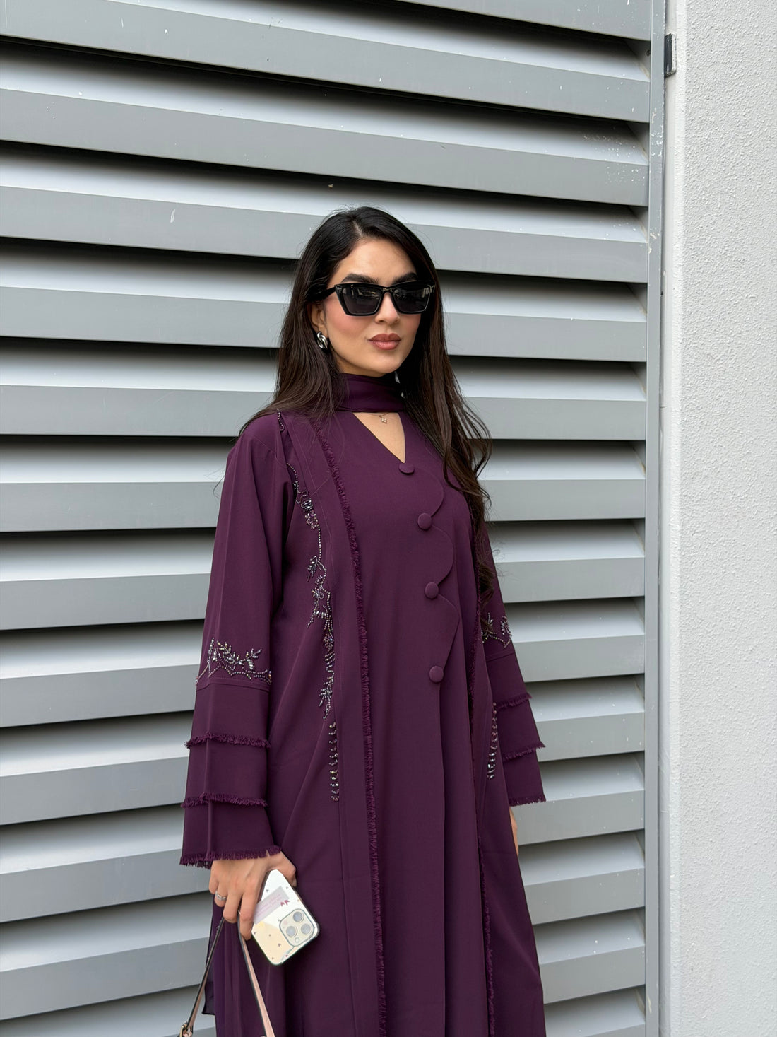 A statement abaya in a deep plum tone, beautifully finished with handcrafted detailing along the...