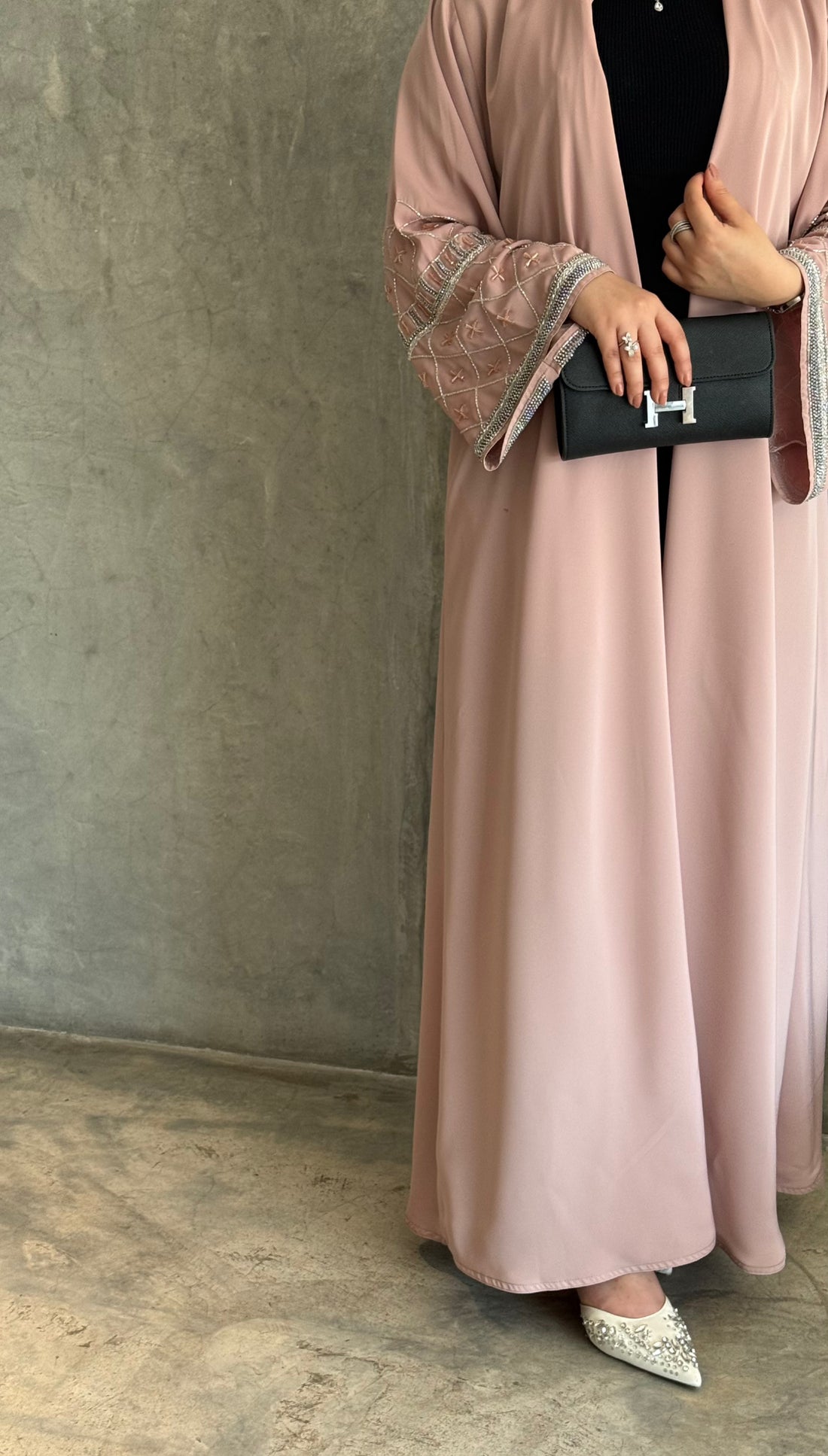 A graceful abaya in a soft blush tone, adorned with exquisite handwork along the sleeves...