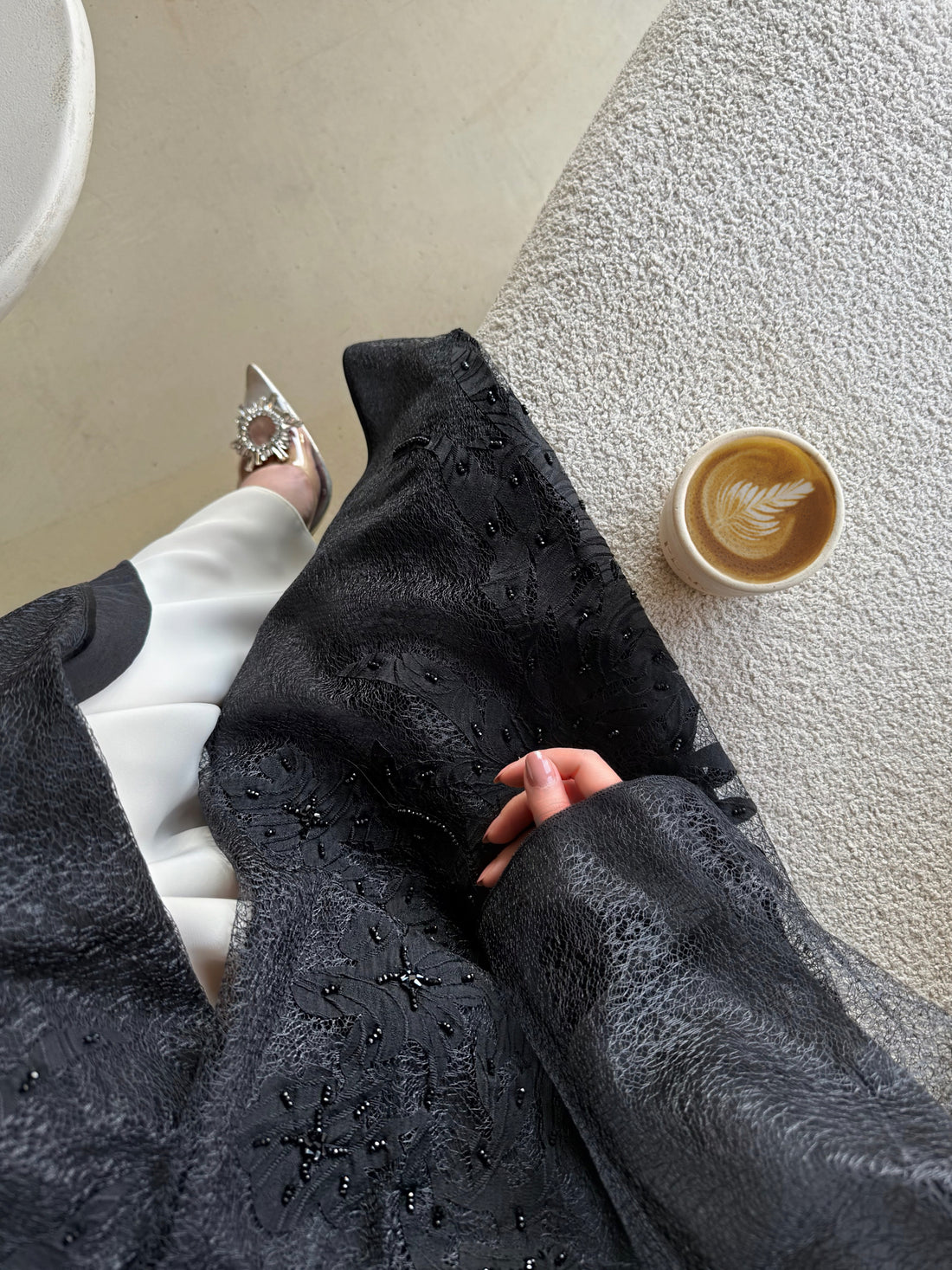 A sophisticated black abaya handcrafted with delicate lace work that adds depth and subtle texture...
