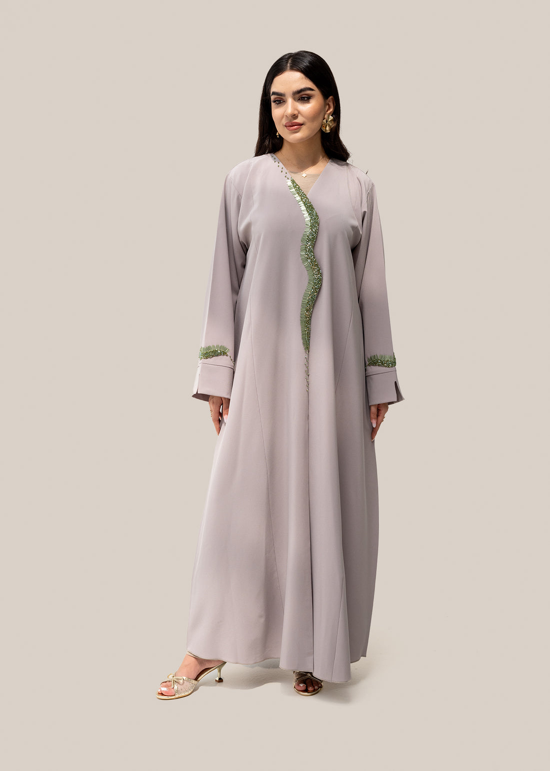 Make a subtle yet striking statement with this pastel abaya adorned with delicate green handmade...
