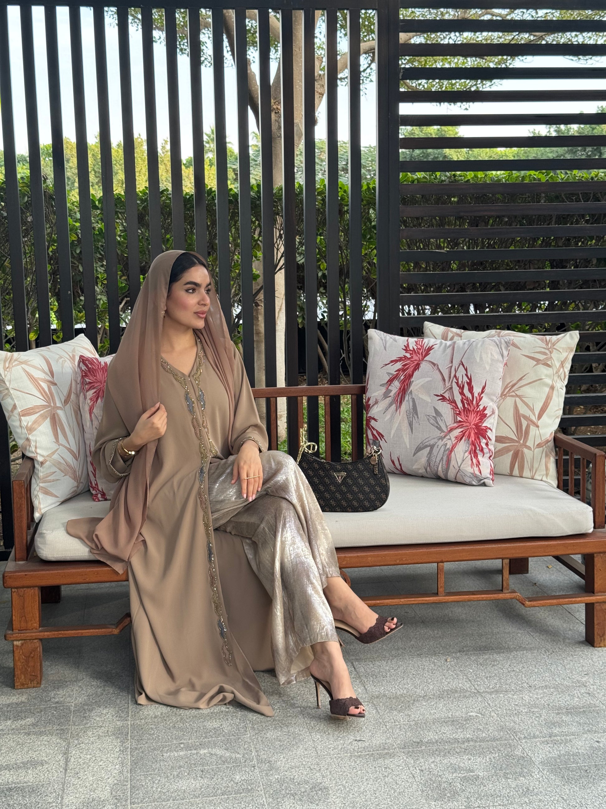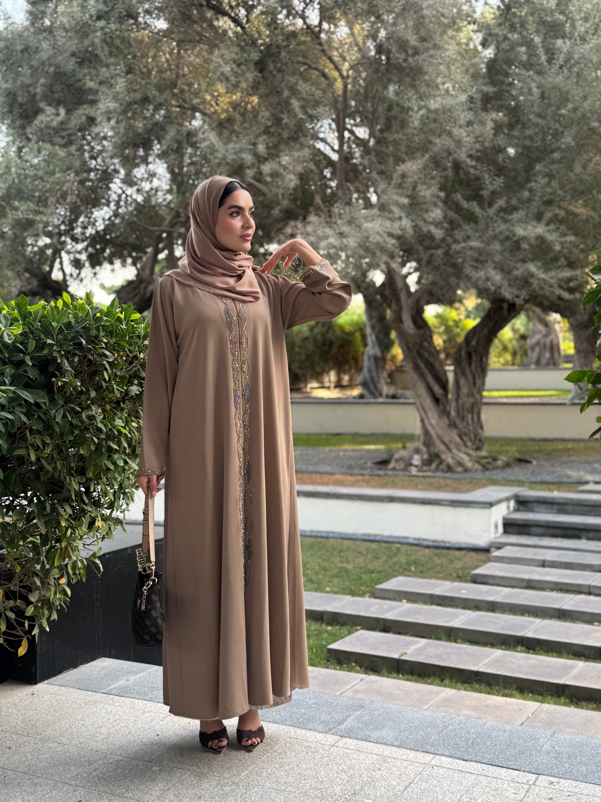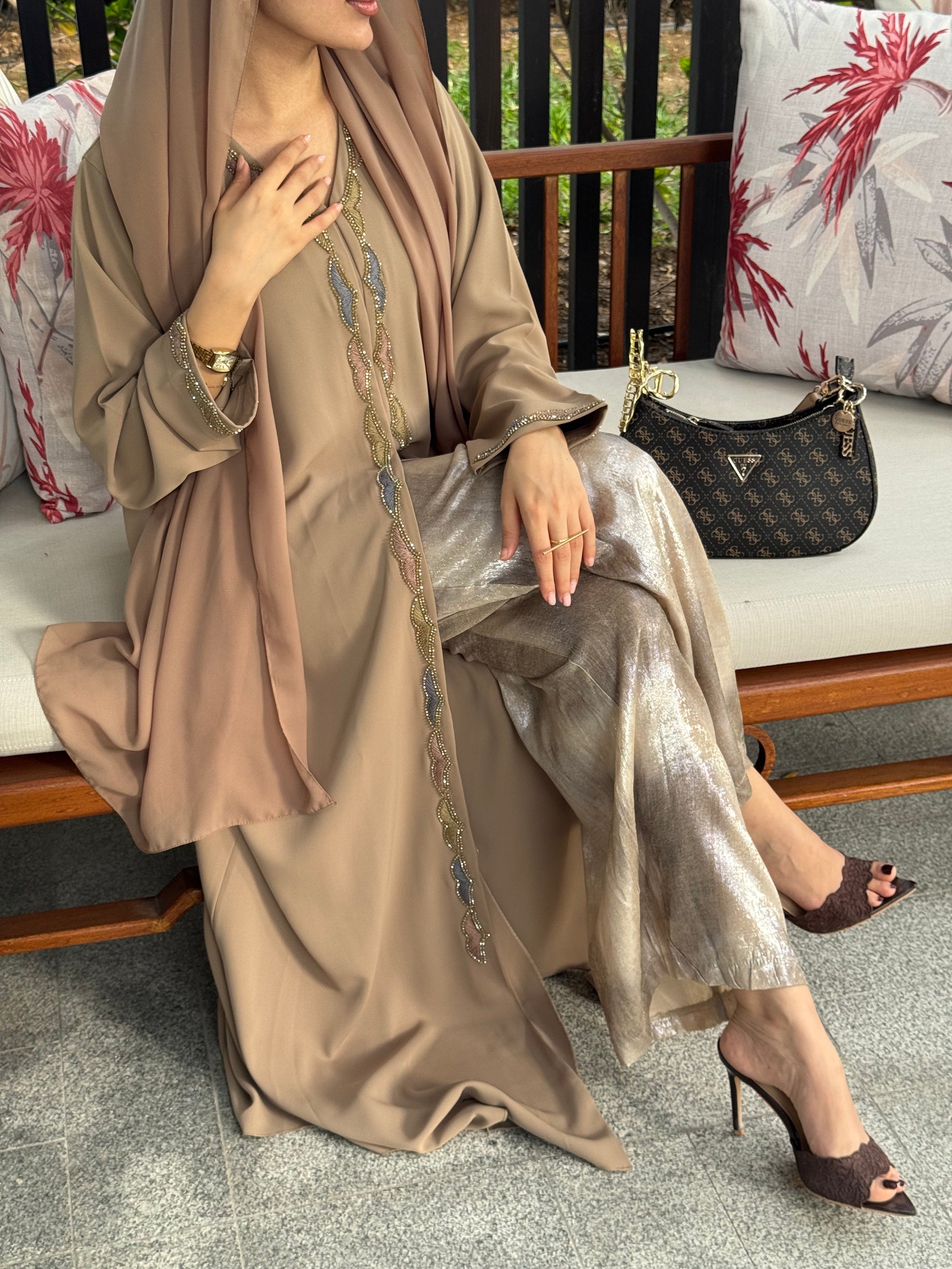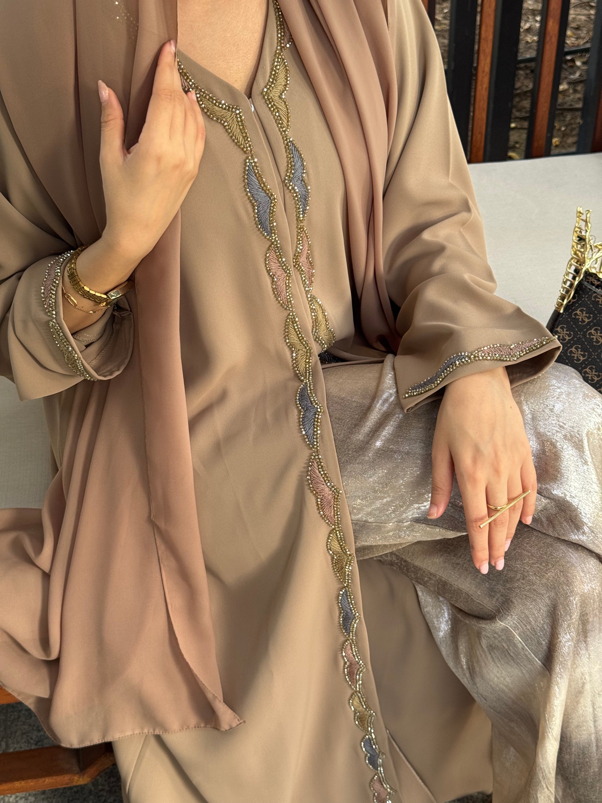This elegant abaya features exquisite handwork and fine thread detailing that add depth and character to its minimalist design. The soft, fluid fabric and subtle embellishments make it a perfect choice for refined everyday wear or understated occasions.