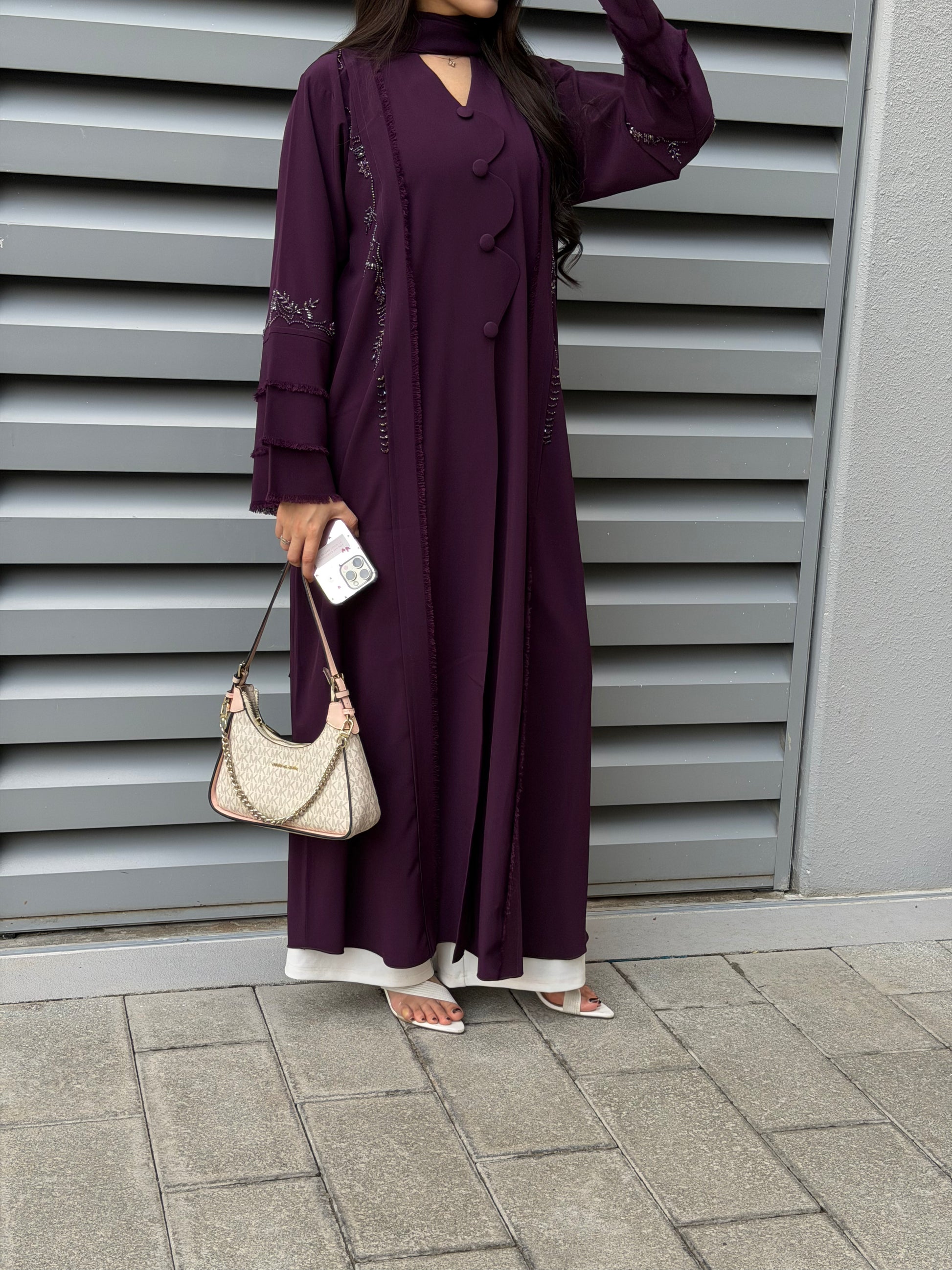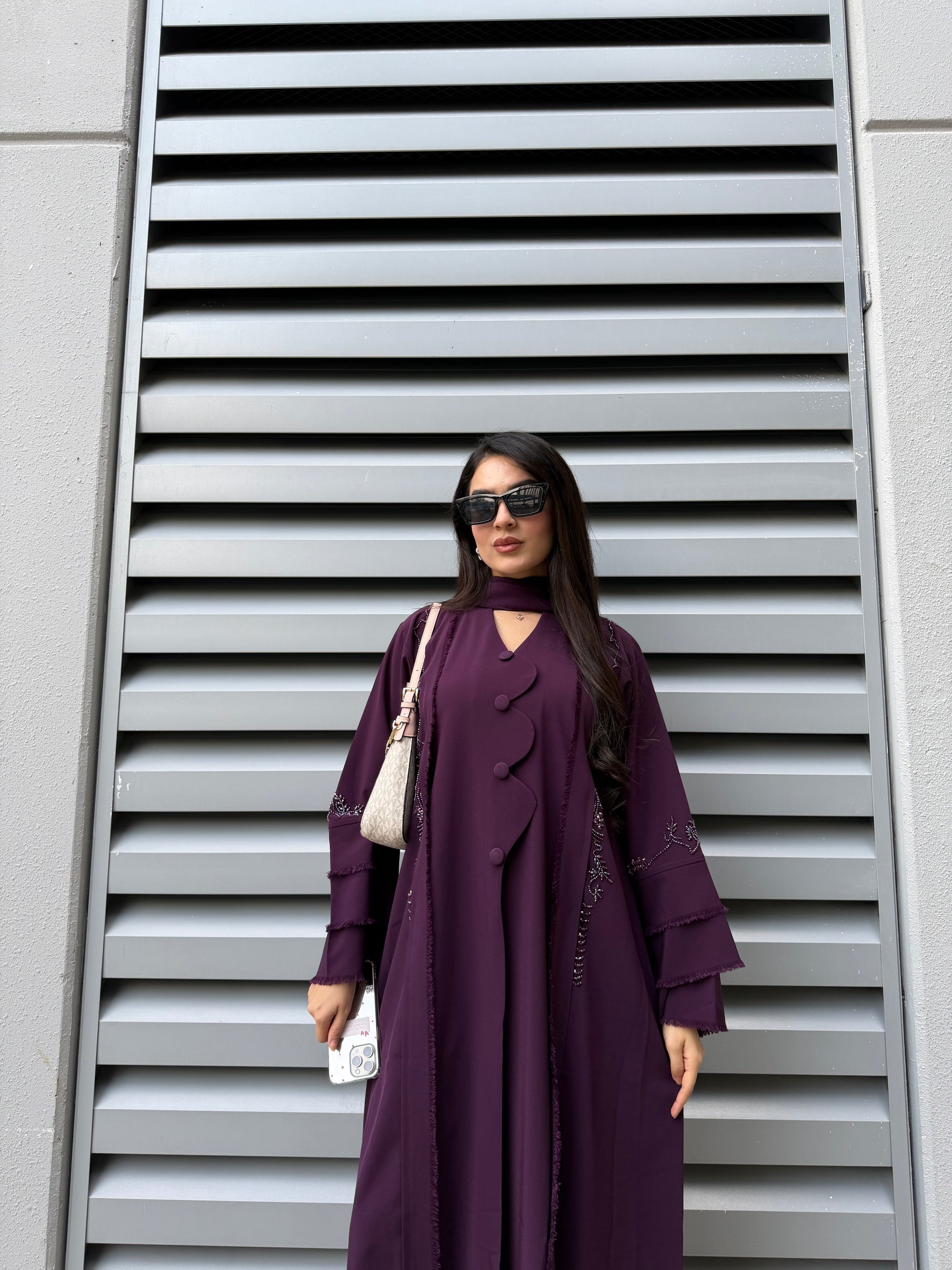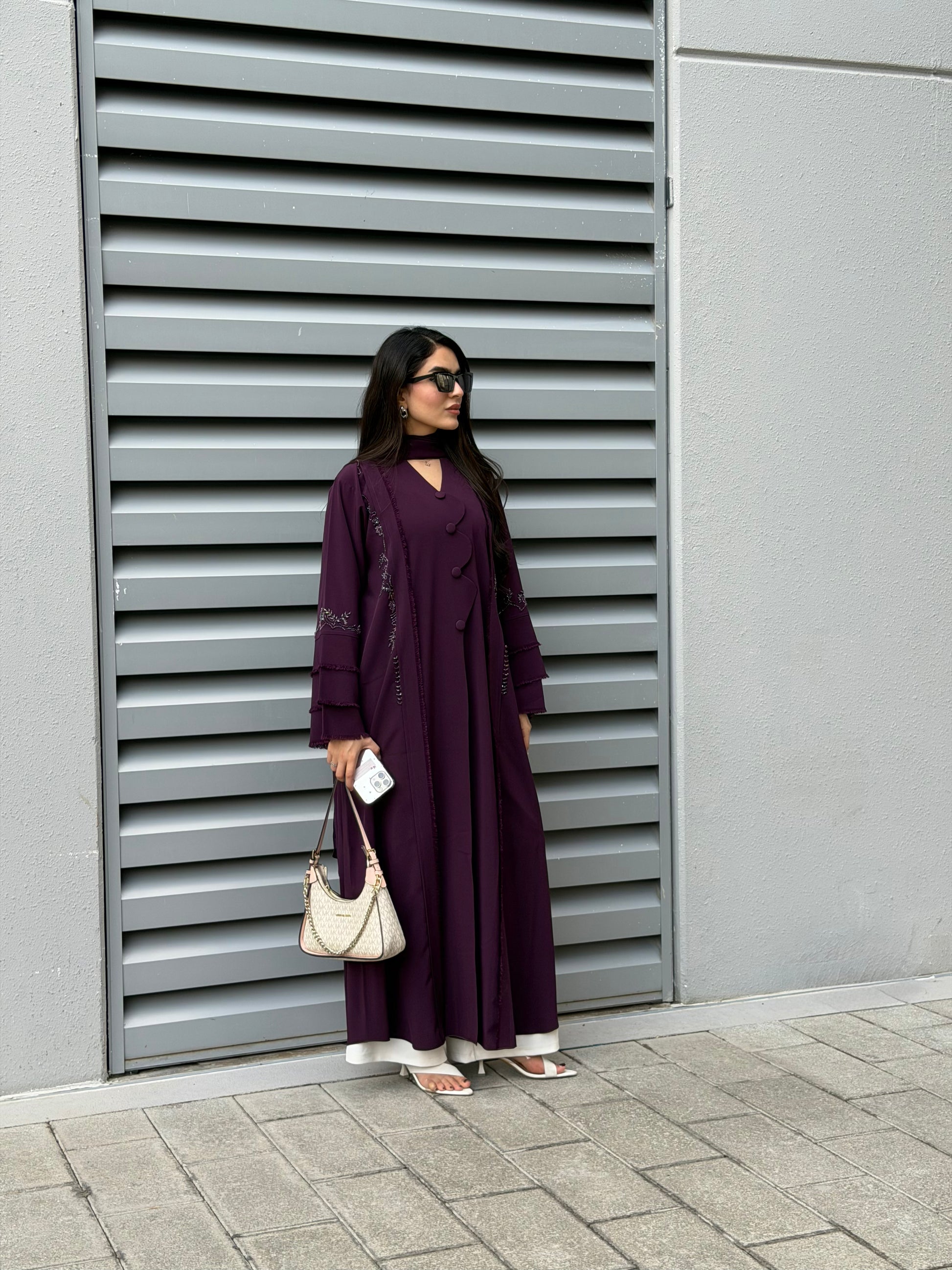 A statement abaya in a deep plum tone, beautifully finished with handcrafted detailing along the sleeves and front. The structured yet fluid silhouette is enhanced with subtle embellishments and fabric accents, creating a refined piece that blends artisanal craftsmanship with modern elegance.