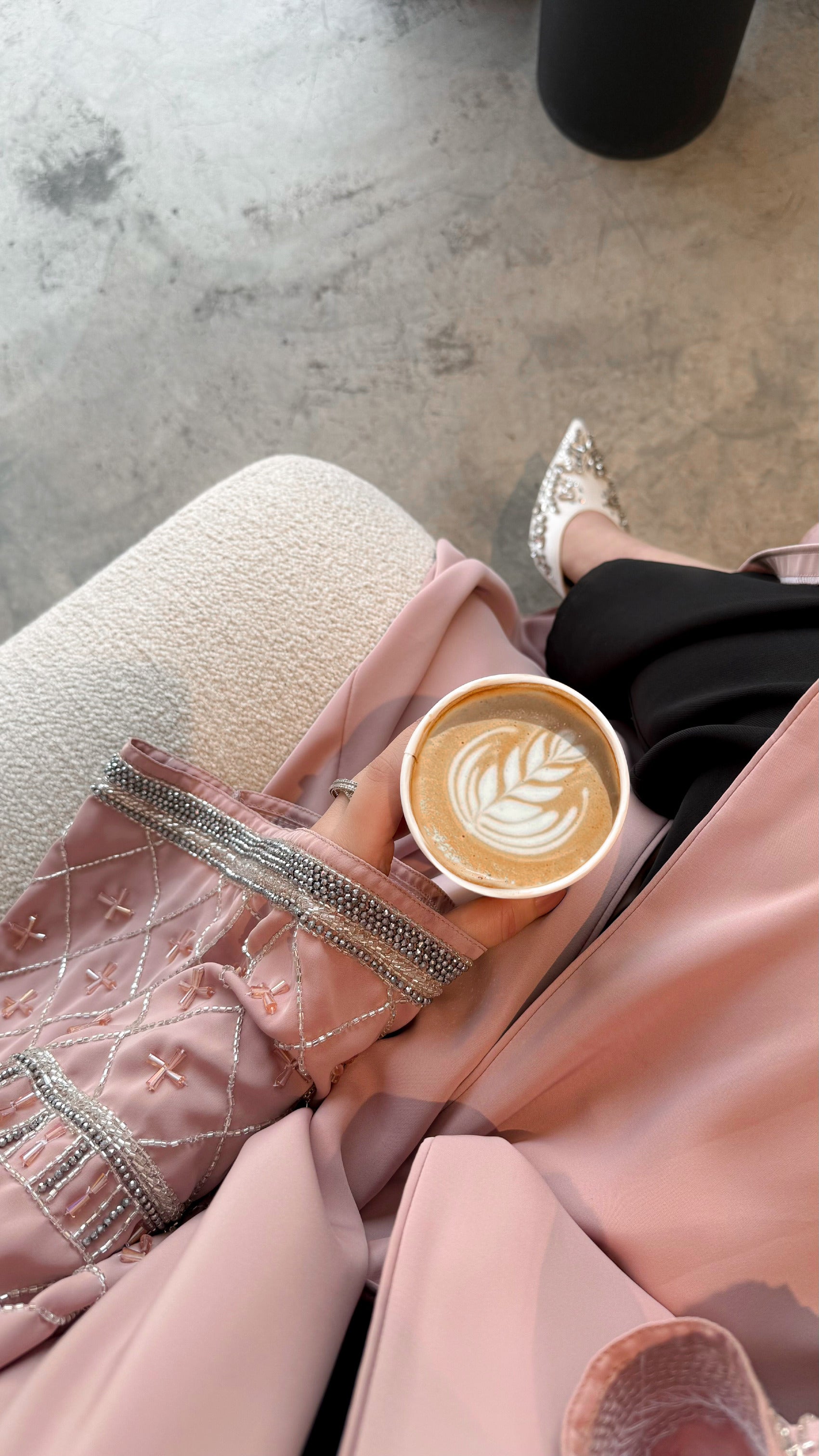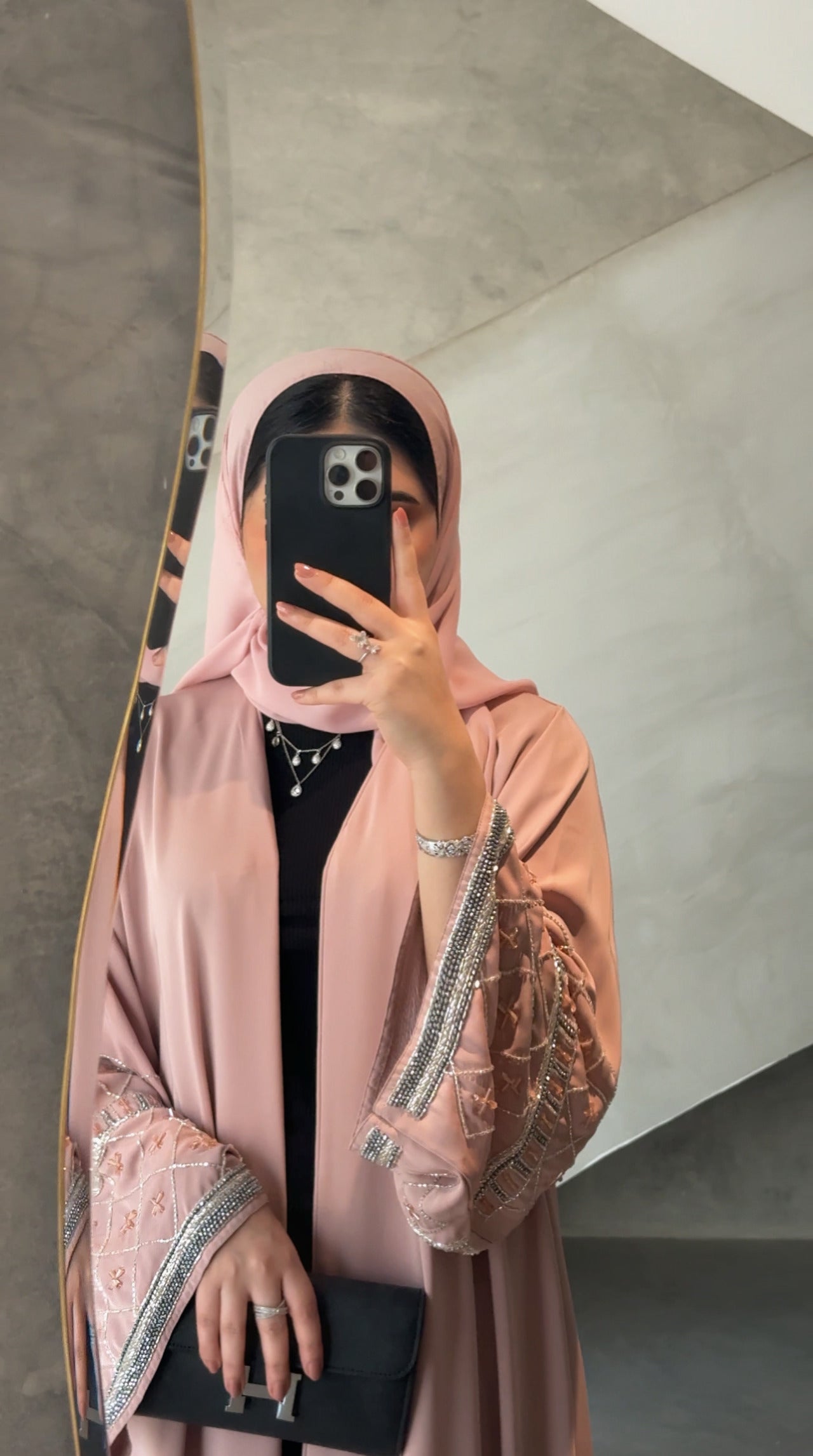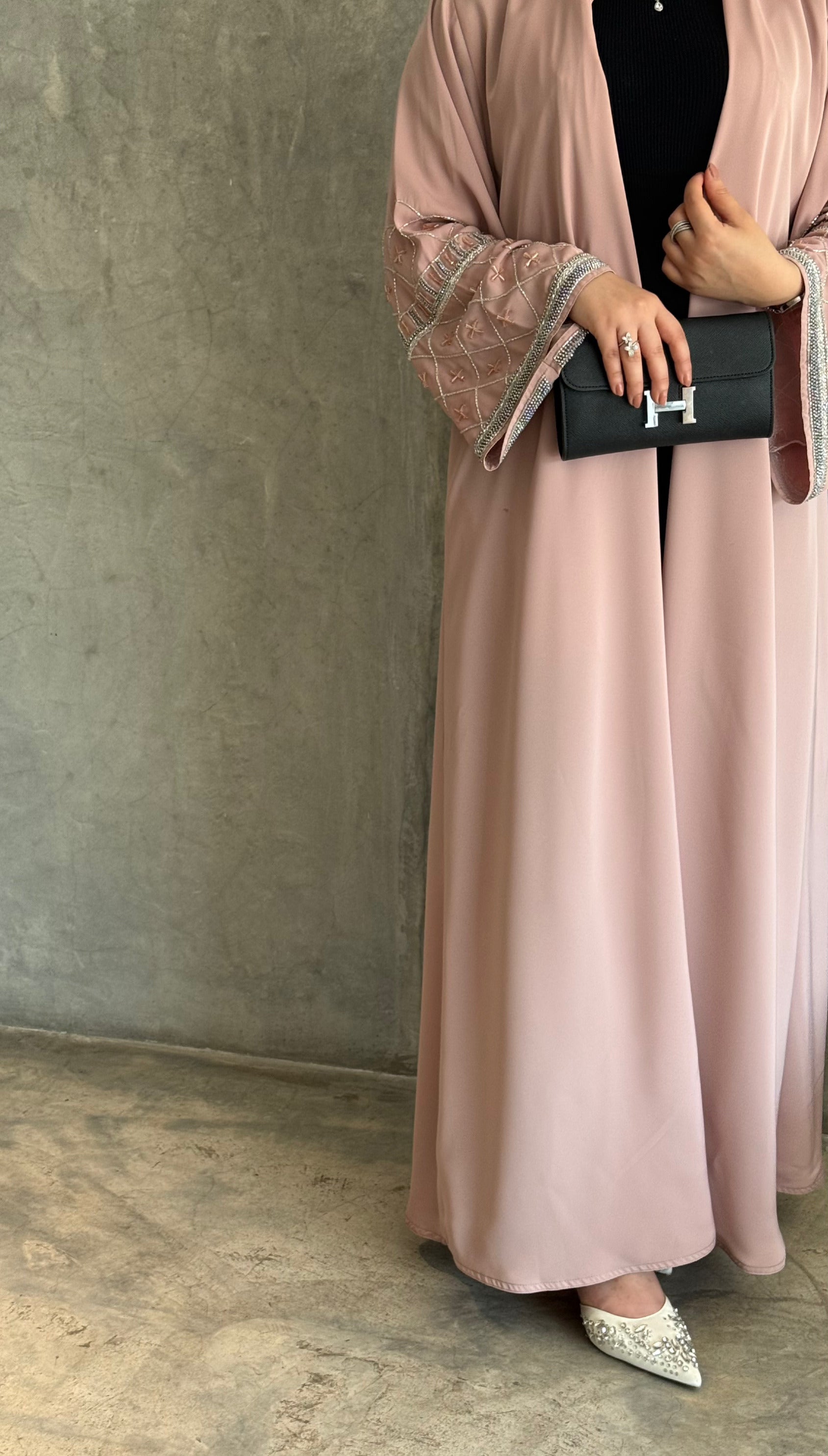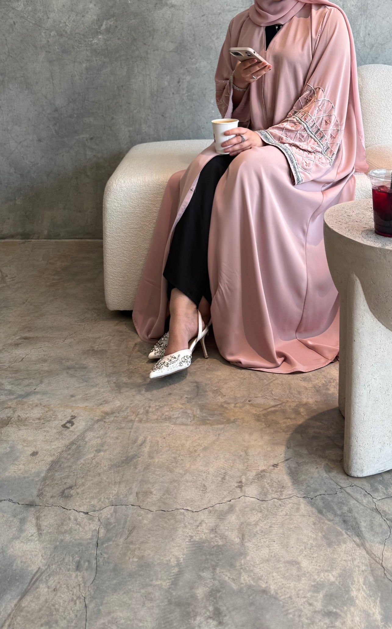 A graceful abaya in a soft blush tone, adorned with exquisite handwork along the sleeves for a refined and feminine finish. The delicate detailing adds texture and elegance, while the fluid silhouette creates a timeless piece suited for both day and evening wear.