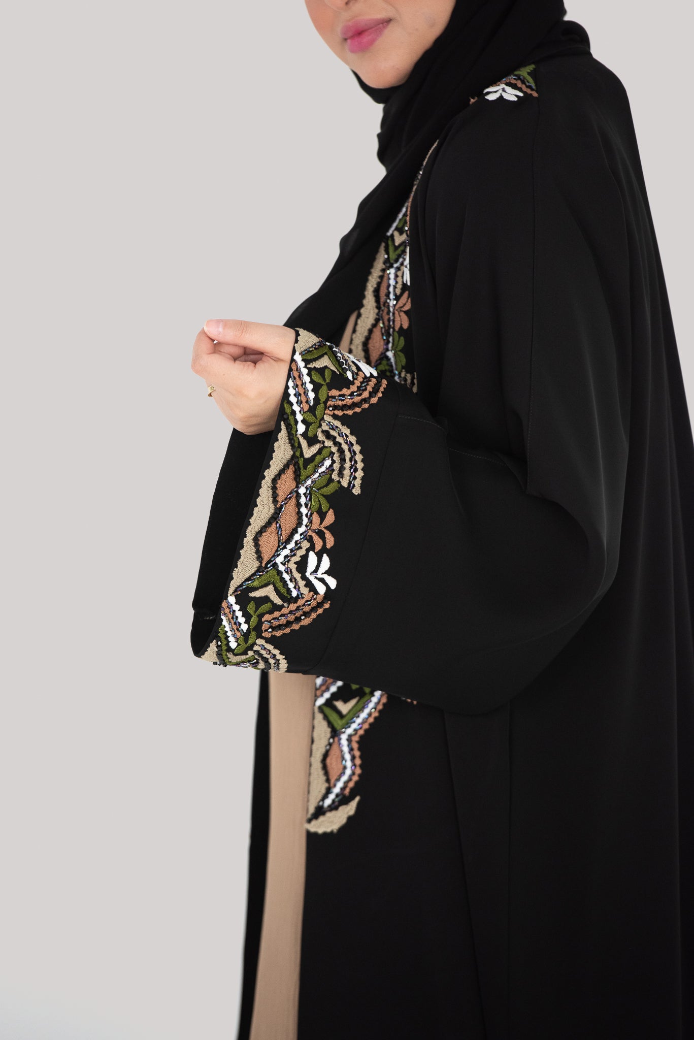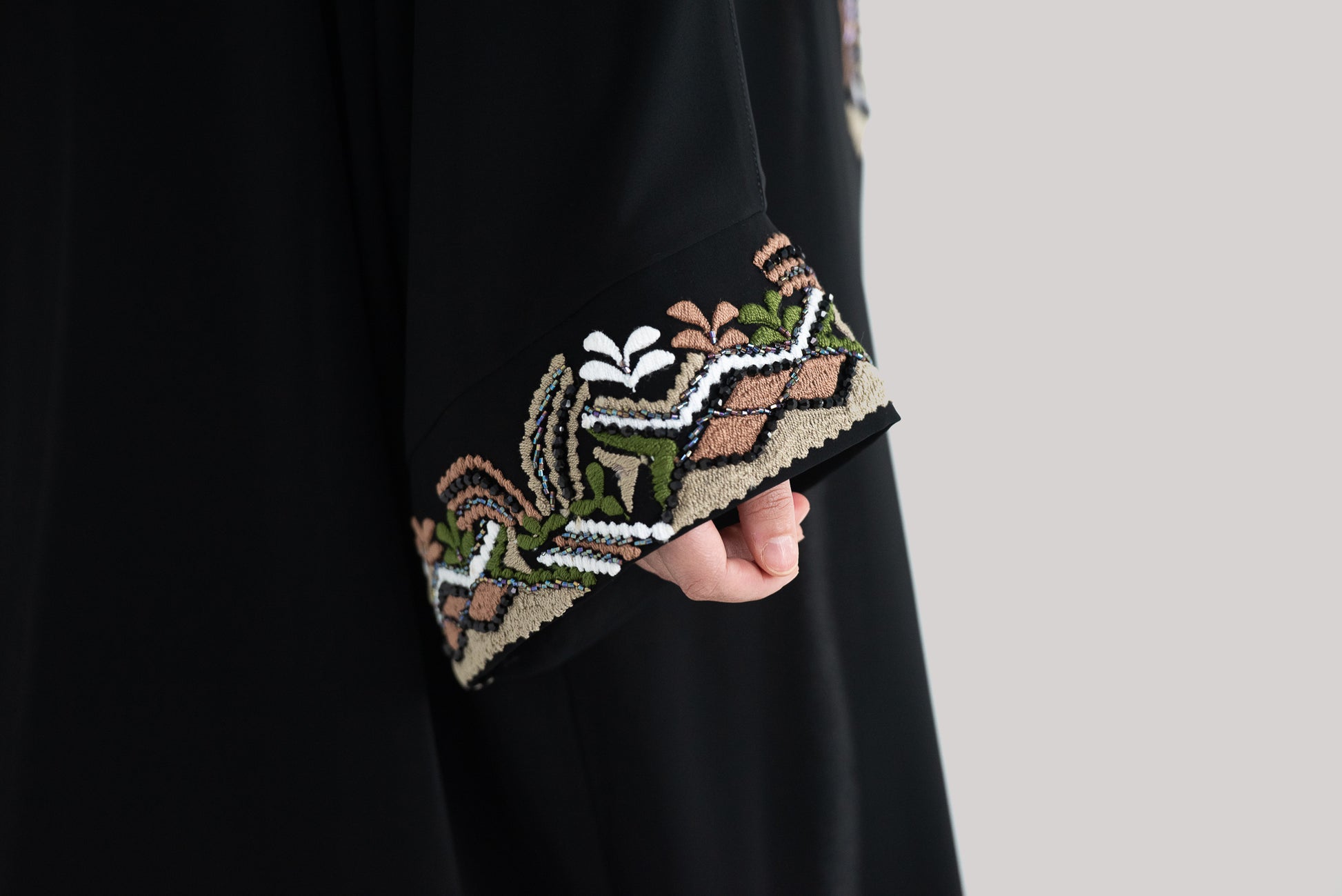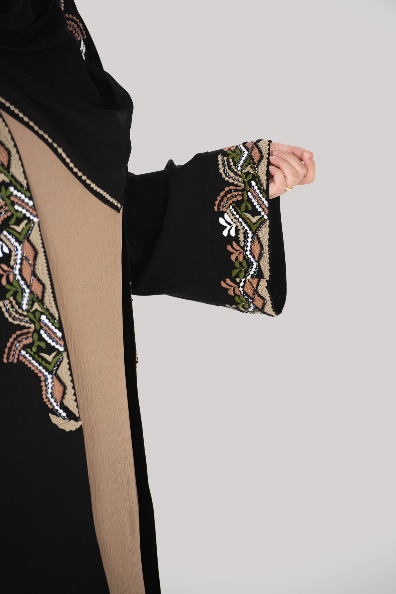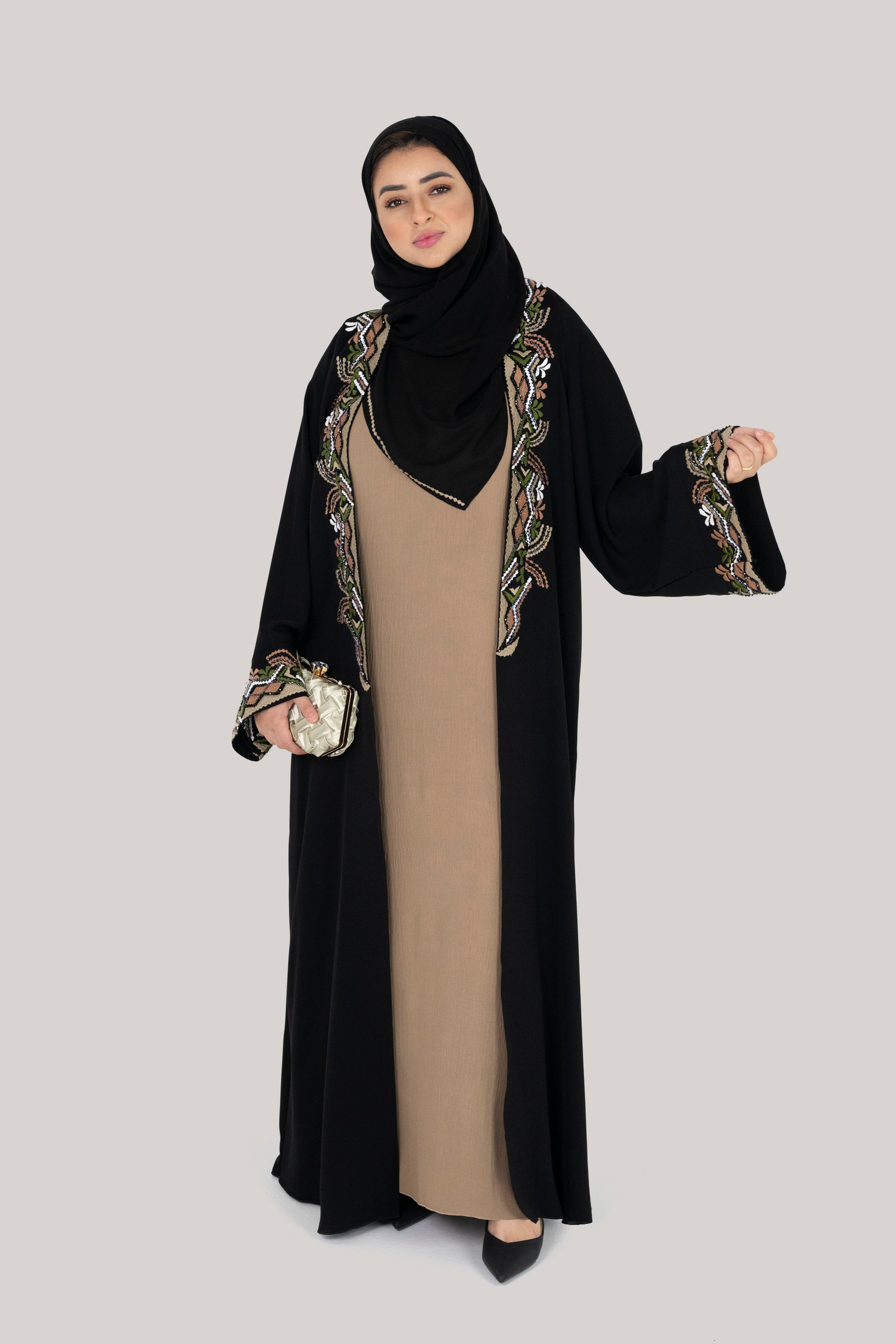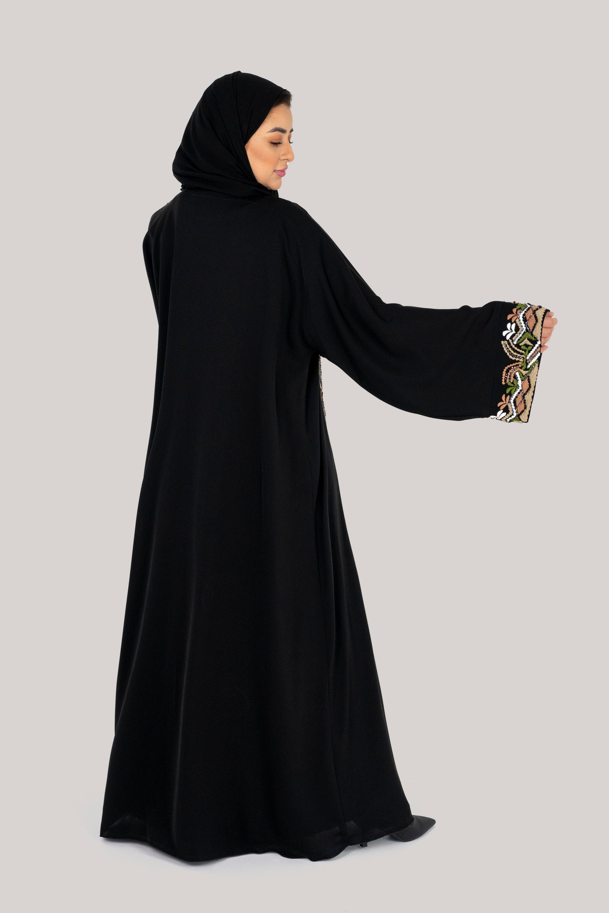 This stunning black handmade bisht combines traditional bisht style with elegant embroidery work. This luxurious handmade piece will be your favorite go to abaya.