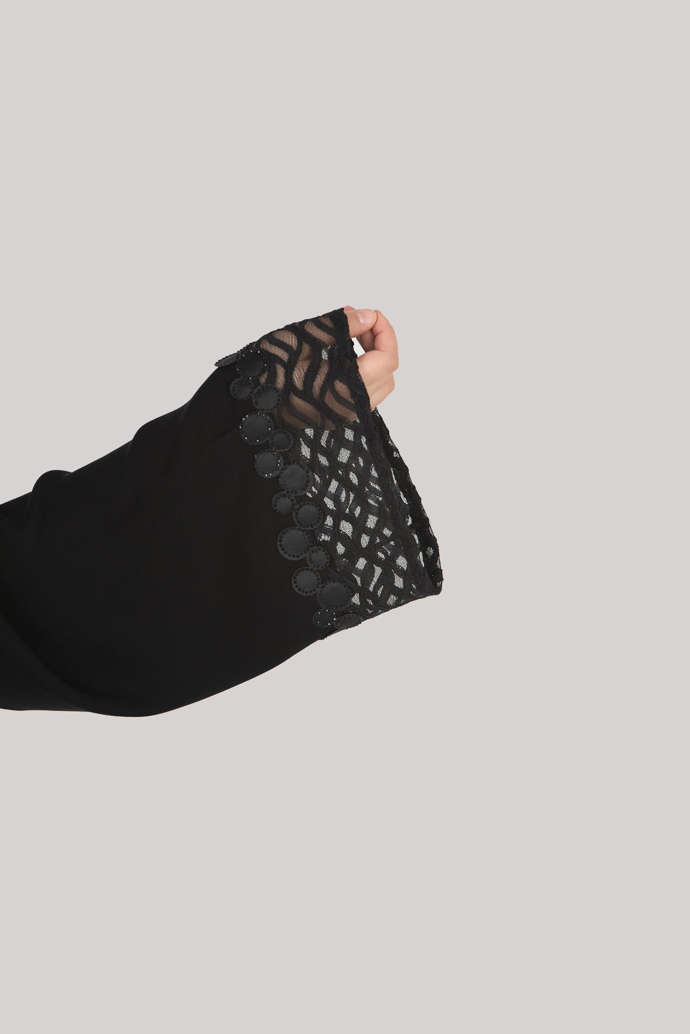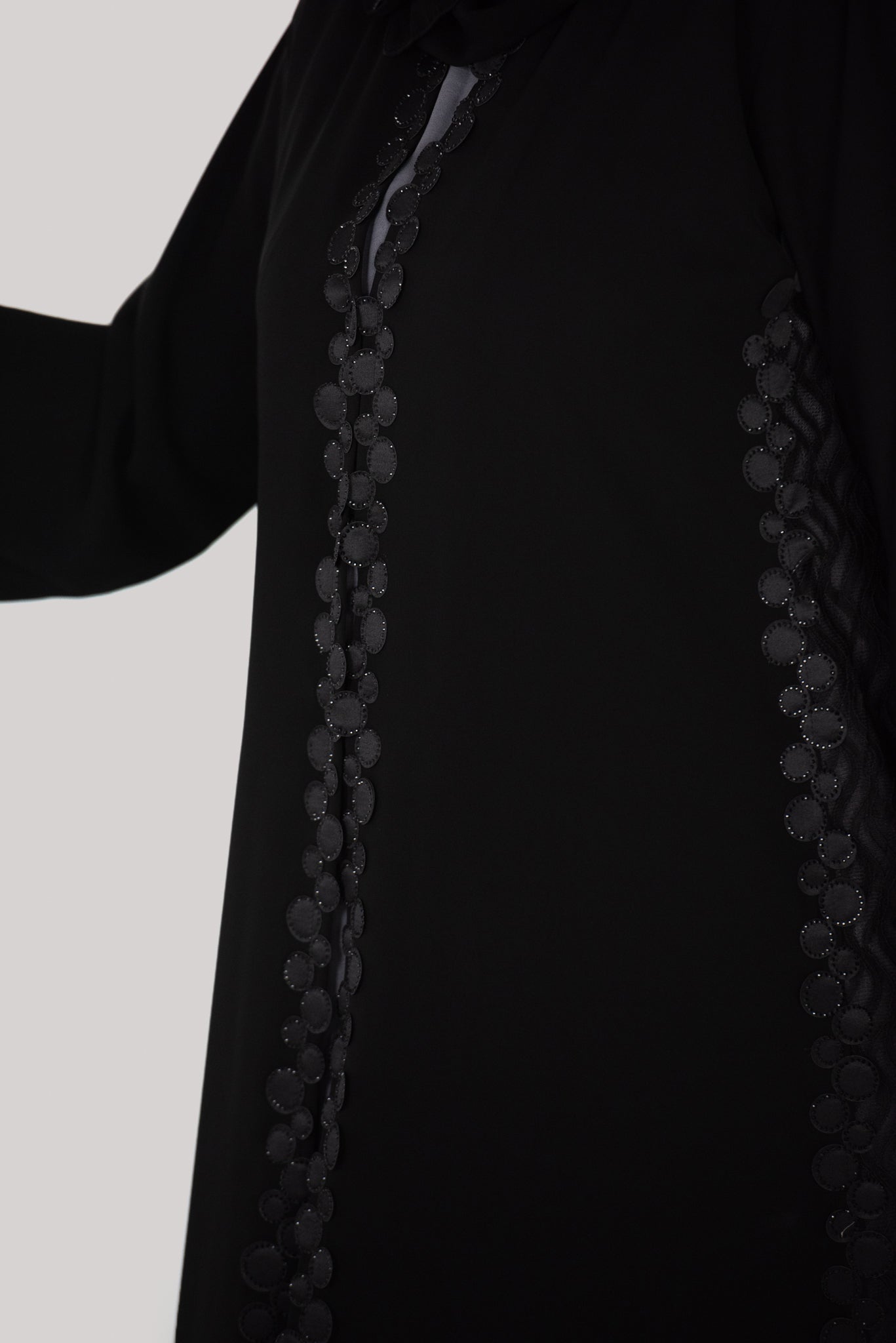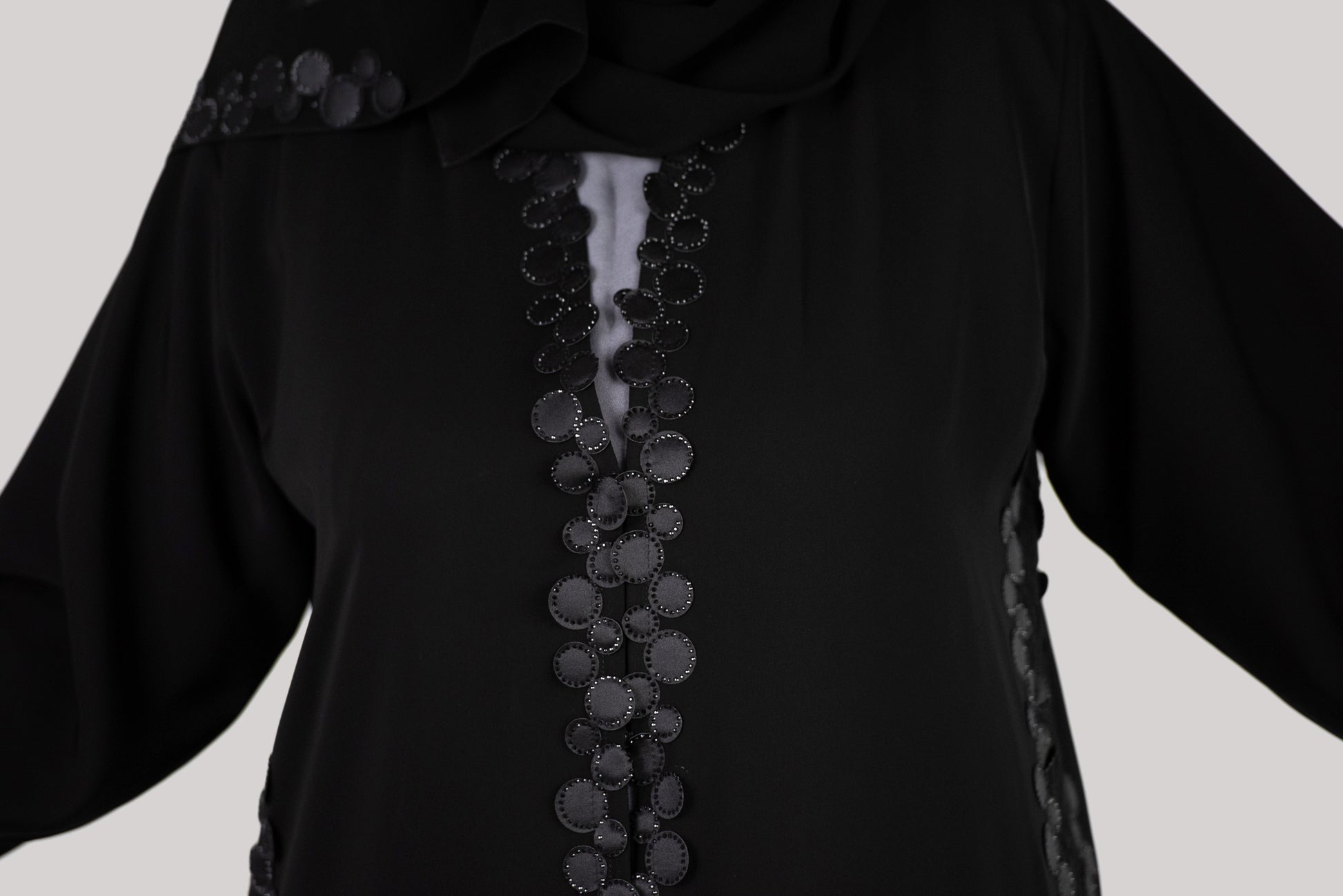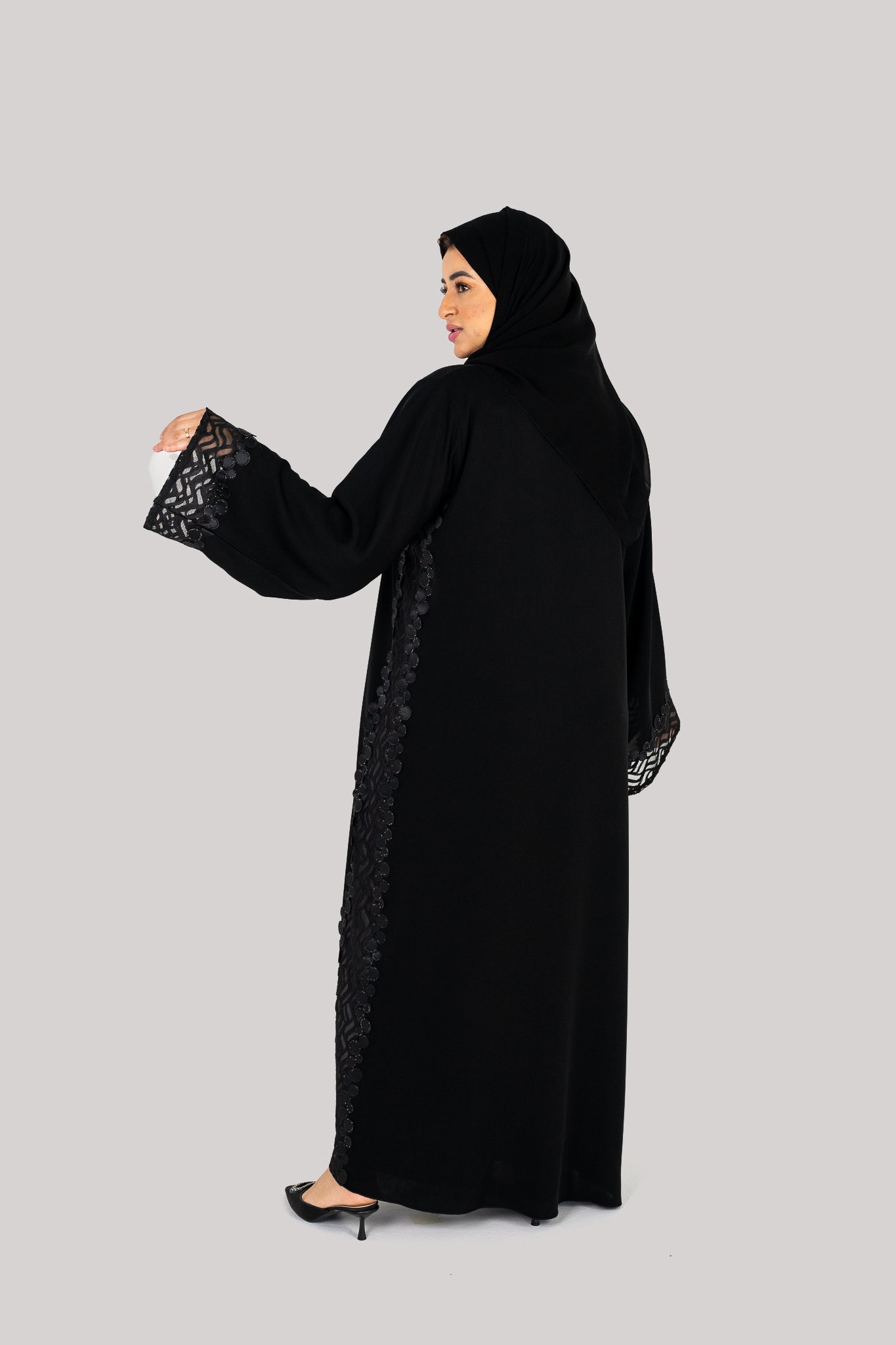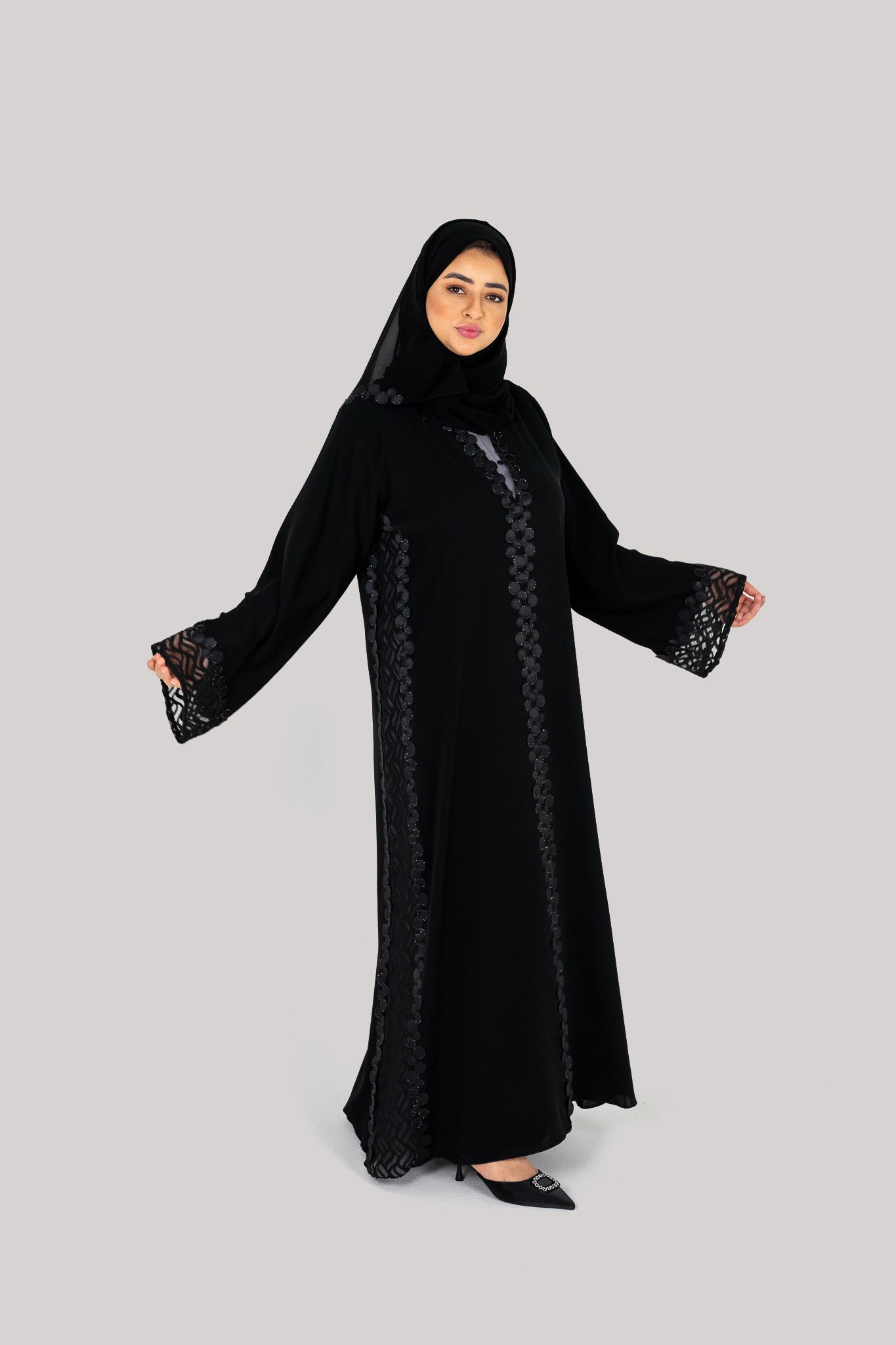 Introducing our transparent modern abaya with laser cut and stone work, perfect for day and evening wear.