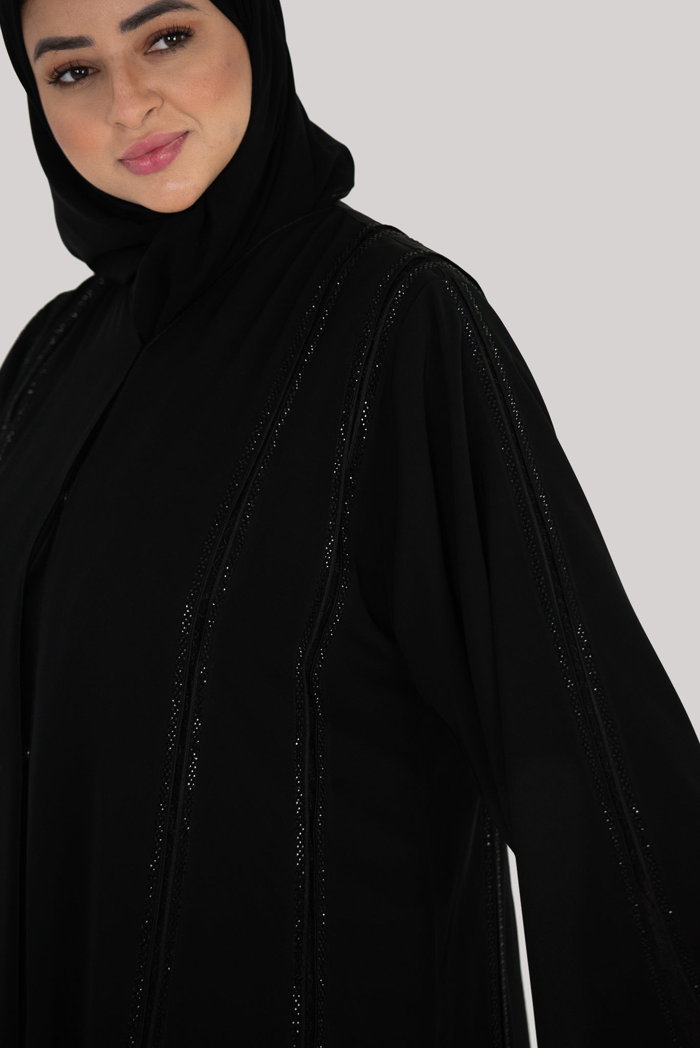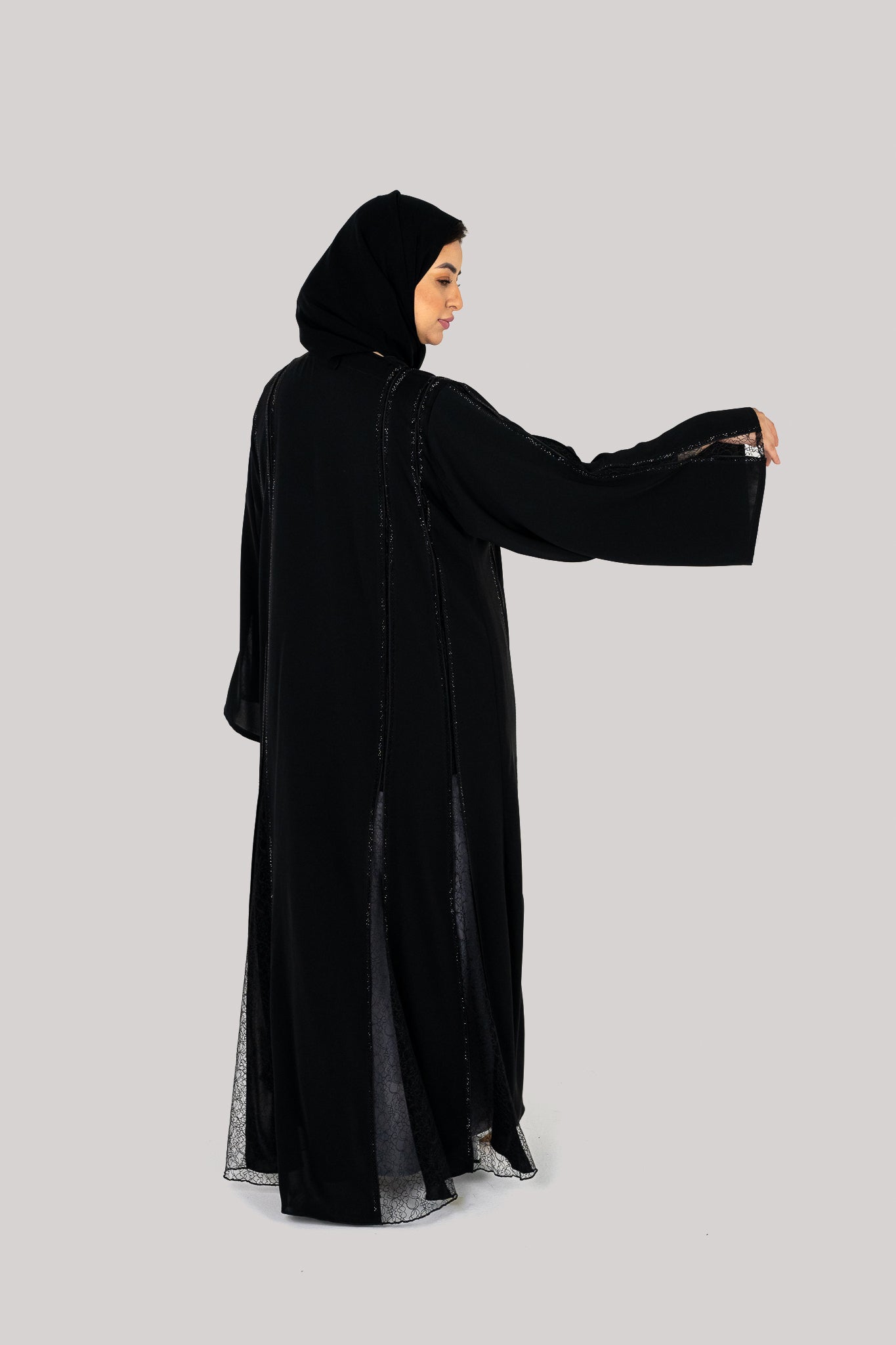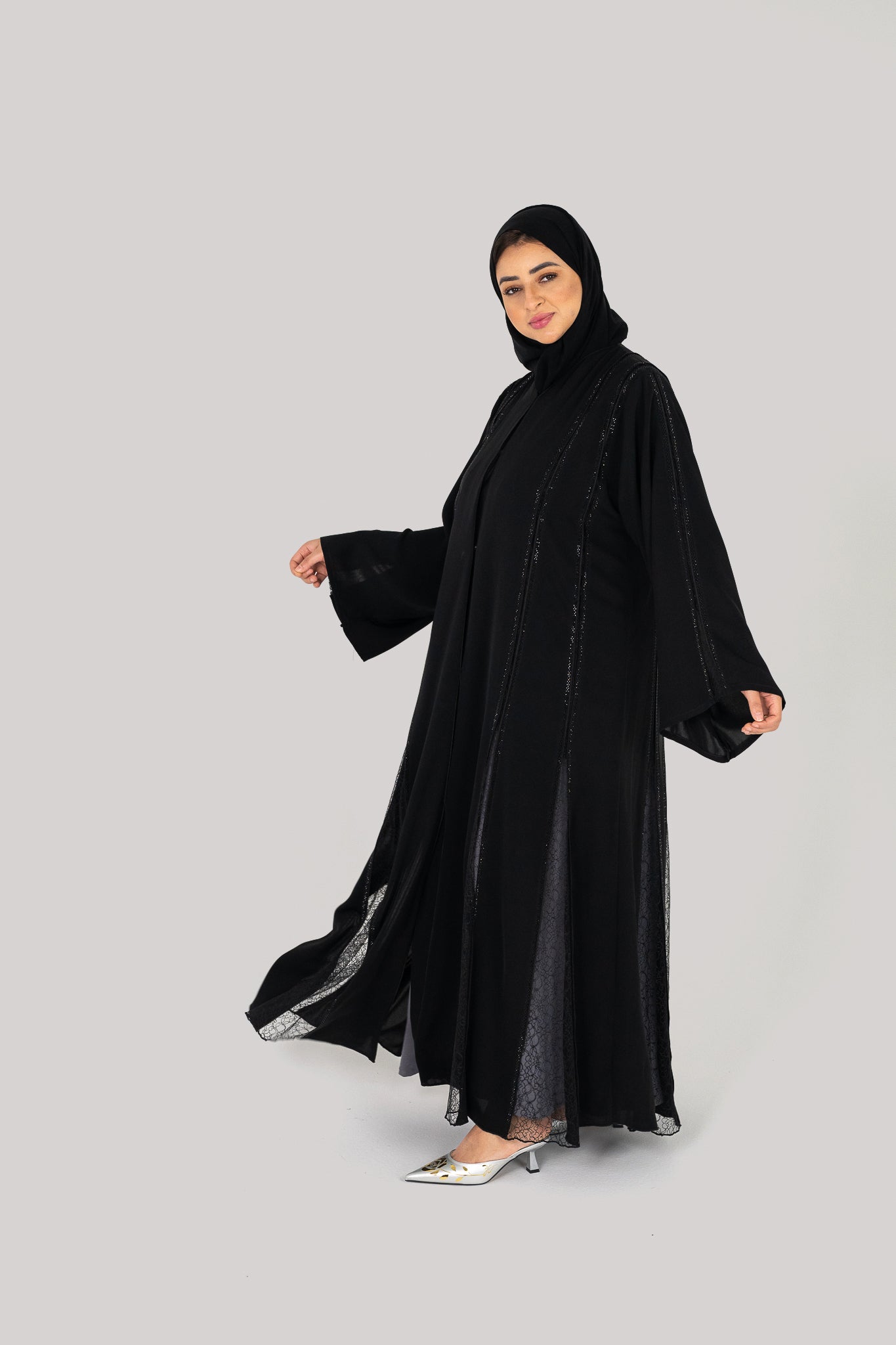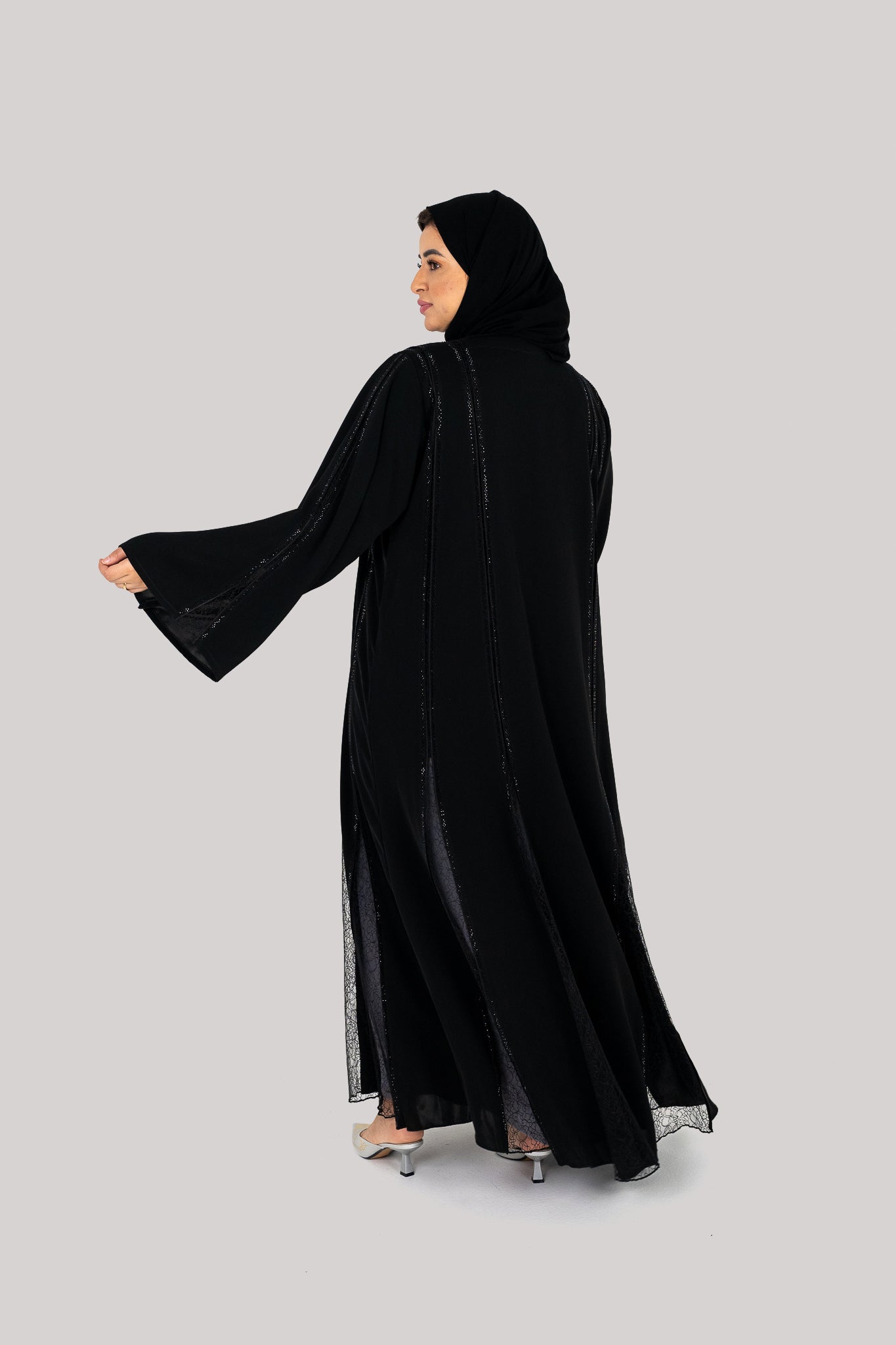 Introducing our trendy flare abaya with net and stone work, Its soft fabric in an umbrella style is comfortable all day wear.