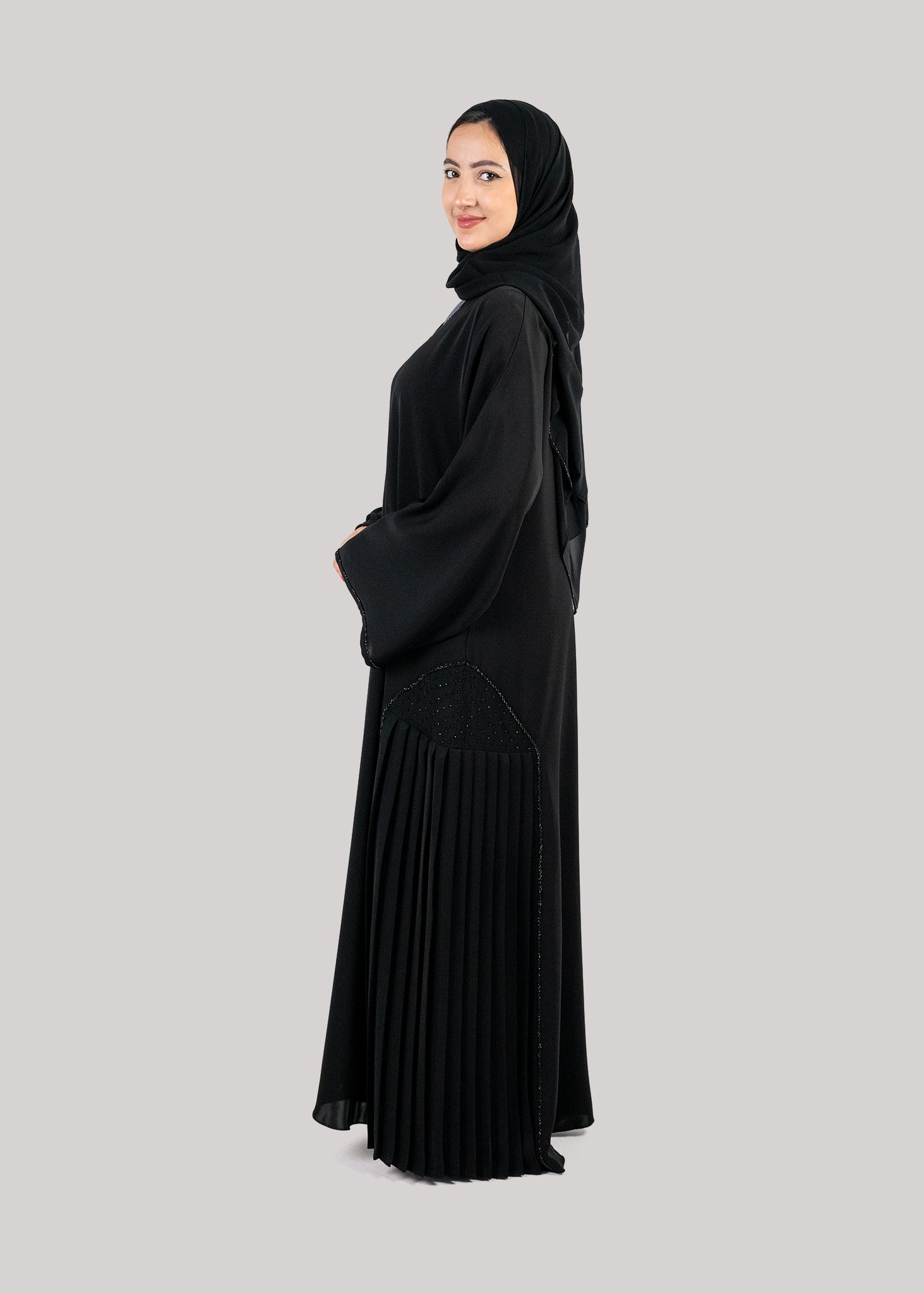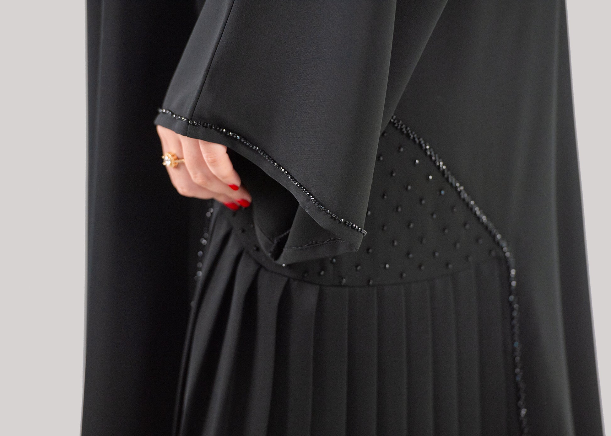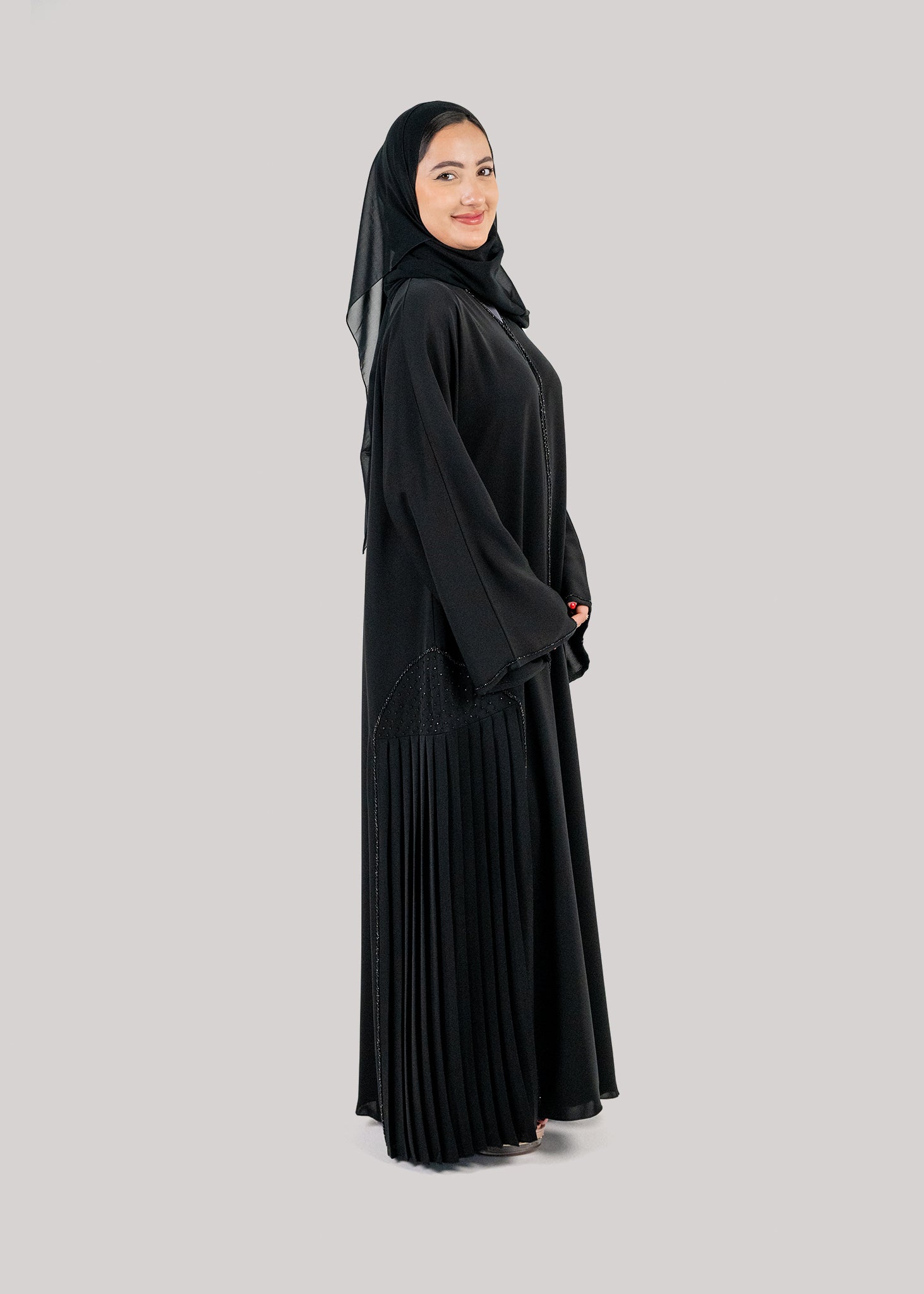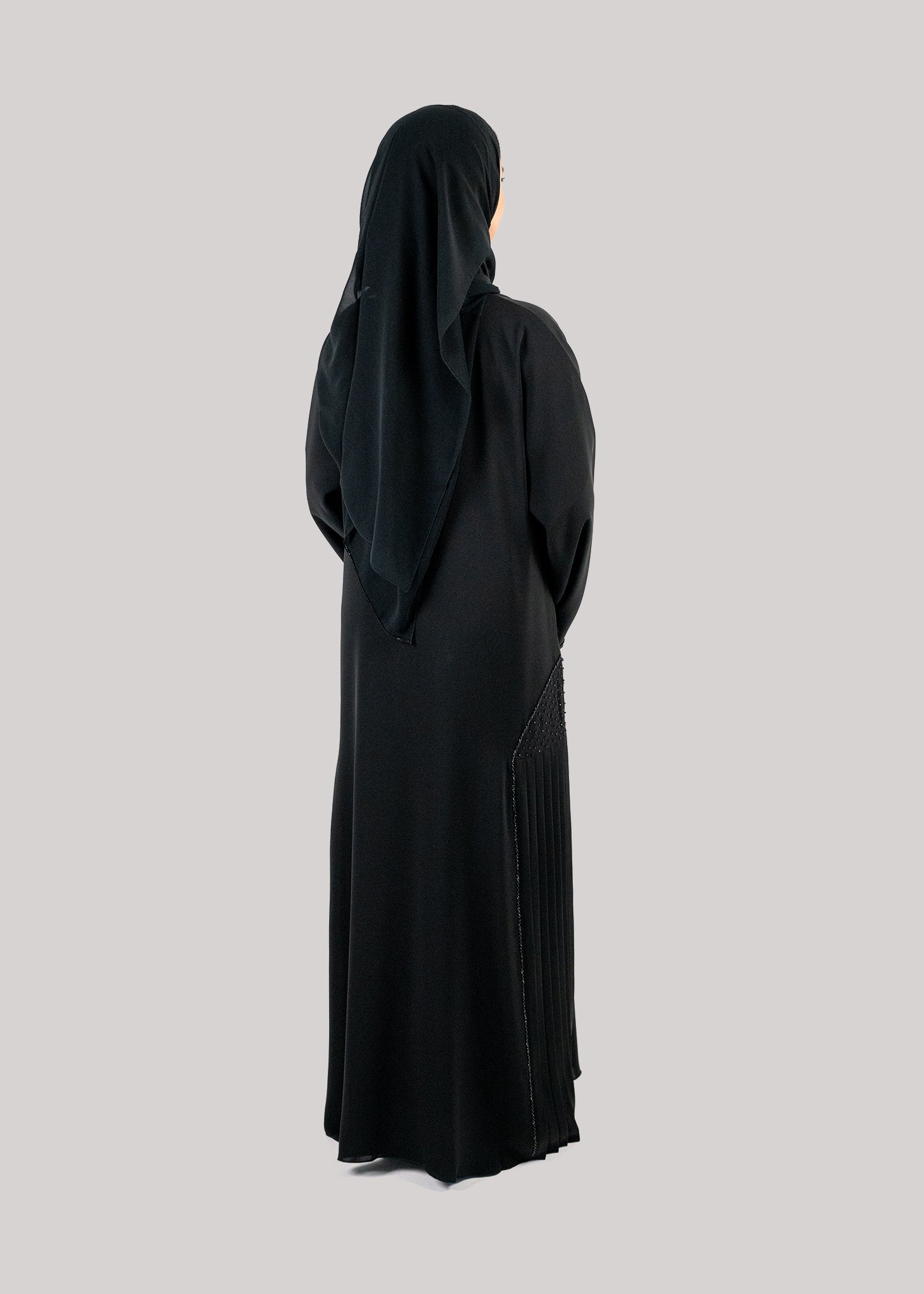 Experience elegance with this hand work abaya with fleet. Its soft fabric with stones on the fleet is comfortable and stylish at the same time.