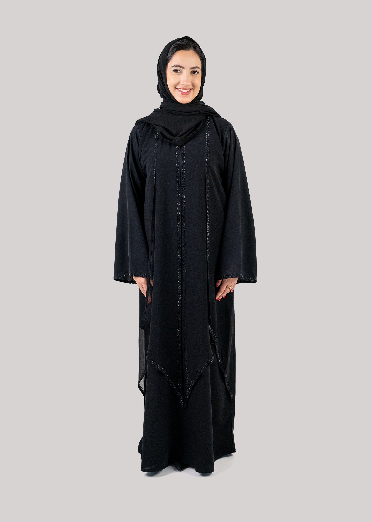 Introducing the trendy abaya with stone work. Its soft fabric means comfortable long day wear.