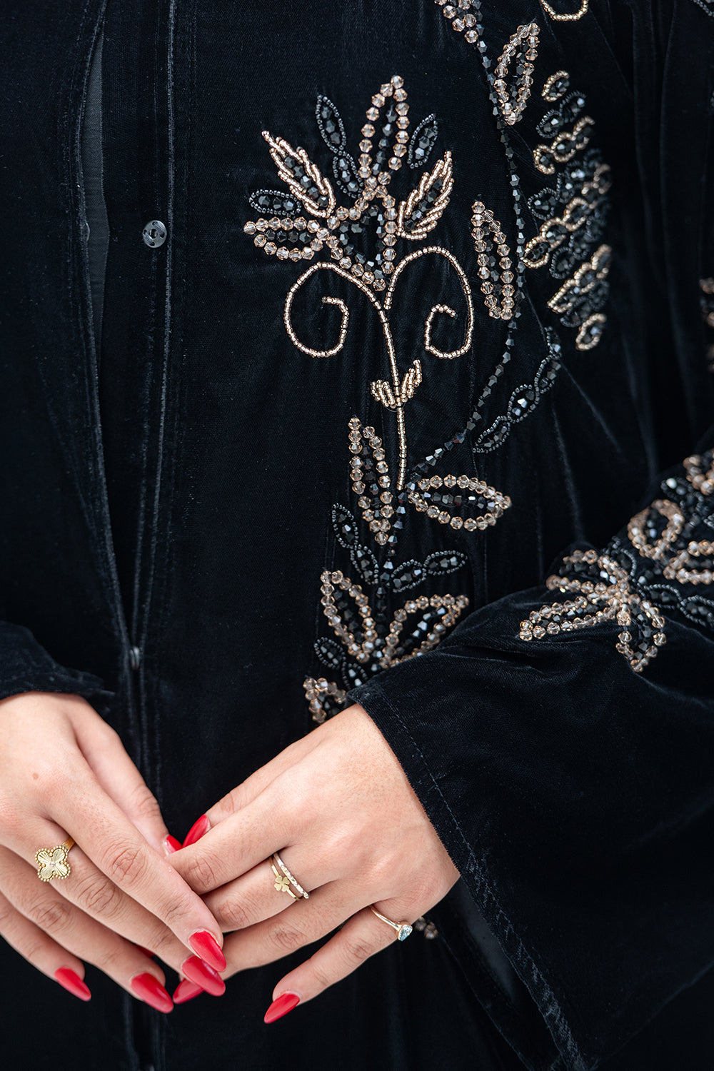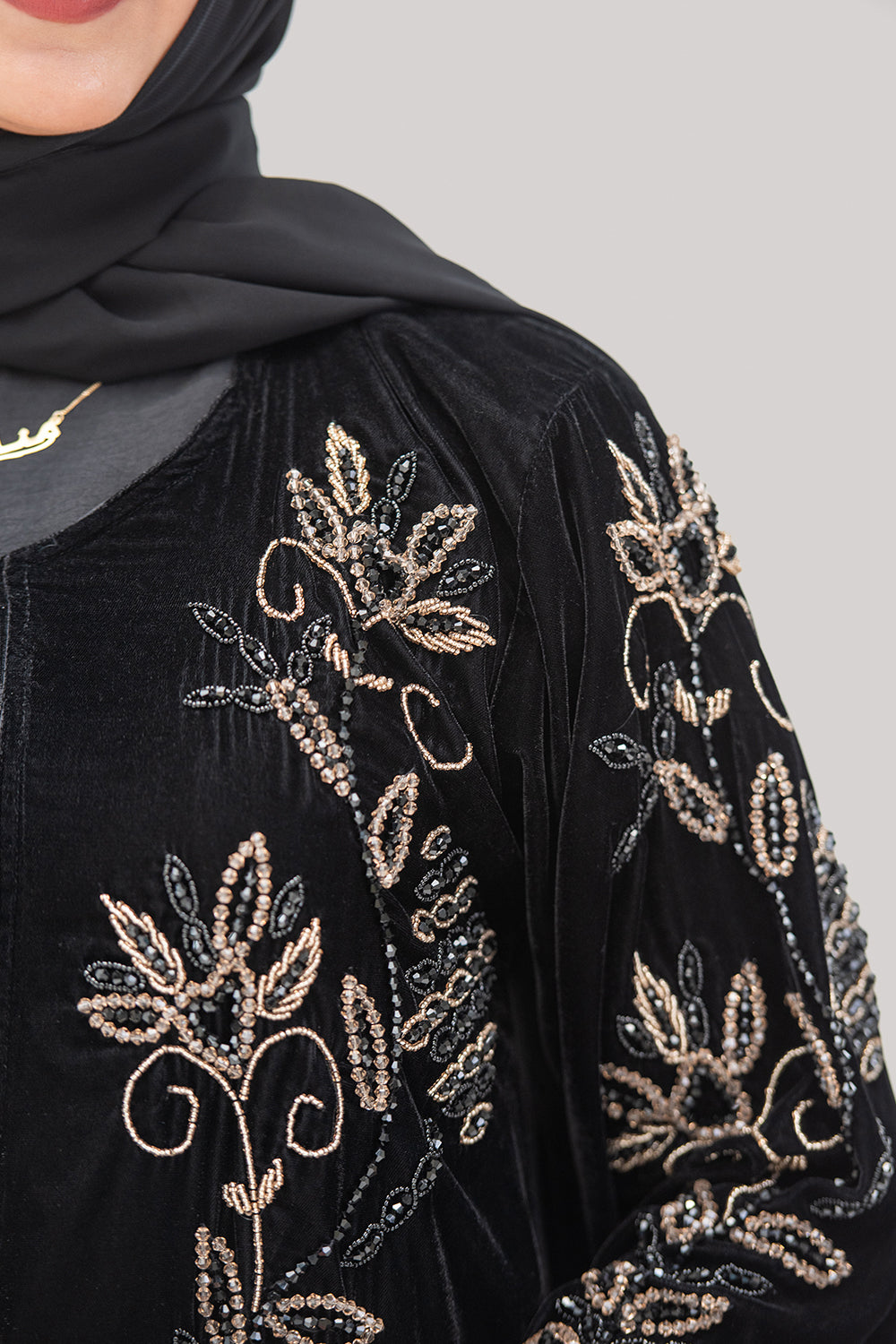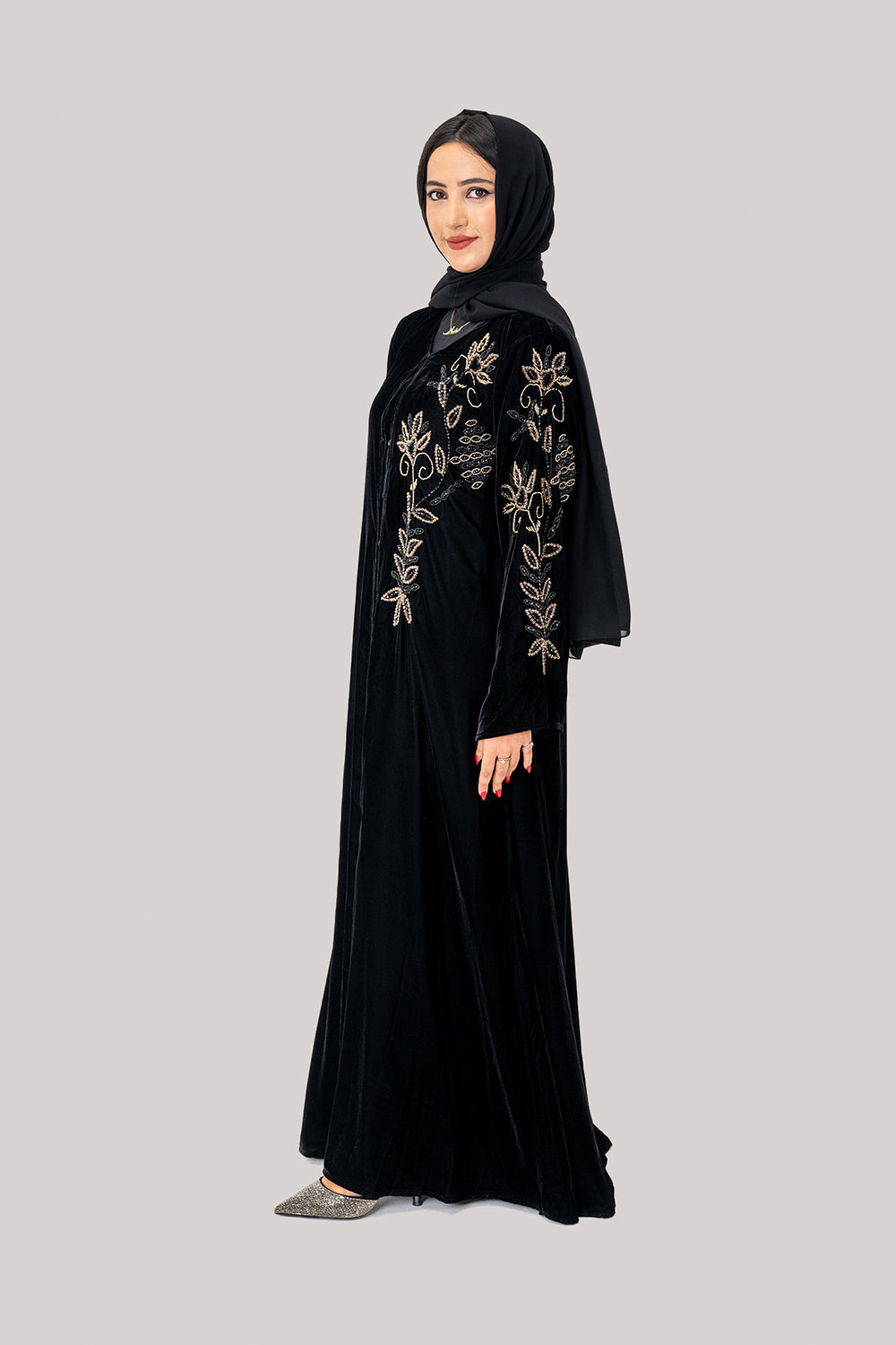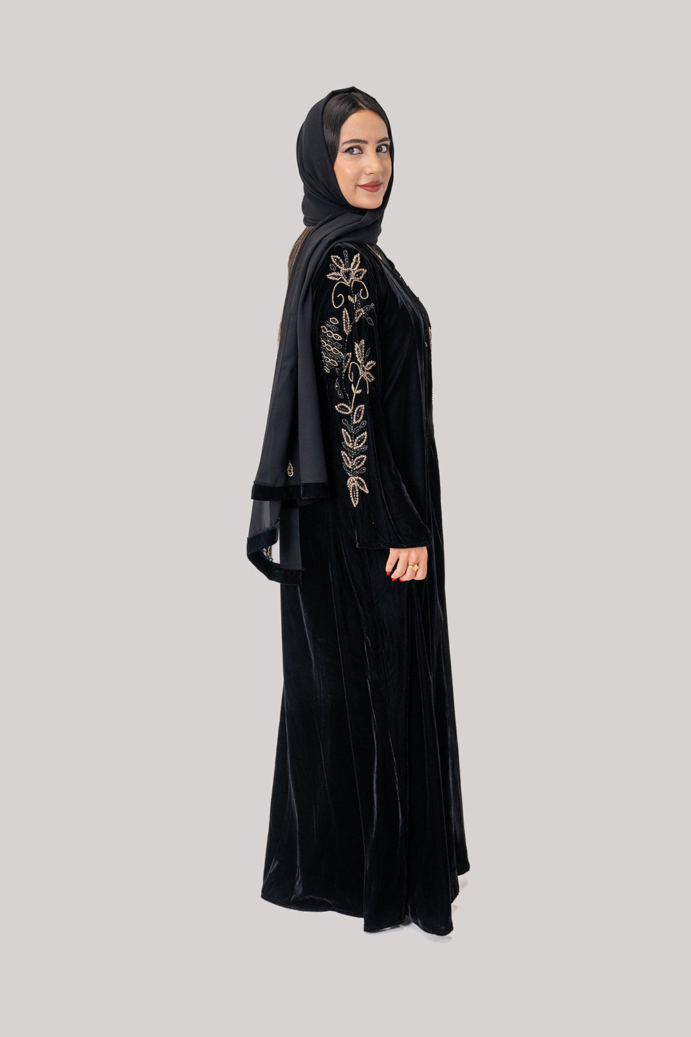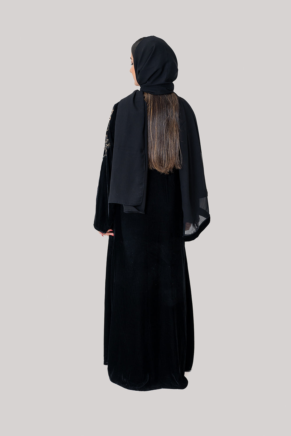 Experience simplicity with the sophistication of hand work in this velvet abaya . Its soft velvet fabric makes it a comfortable all day wear modest clothing.