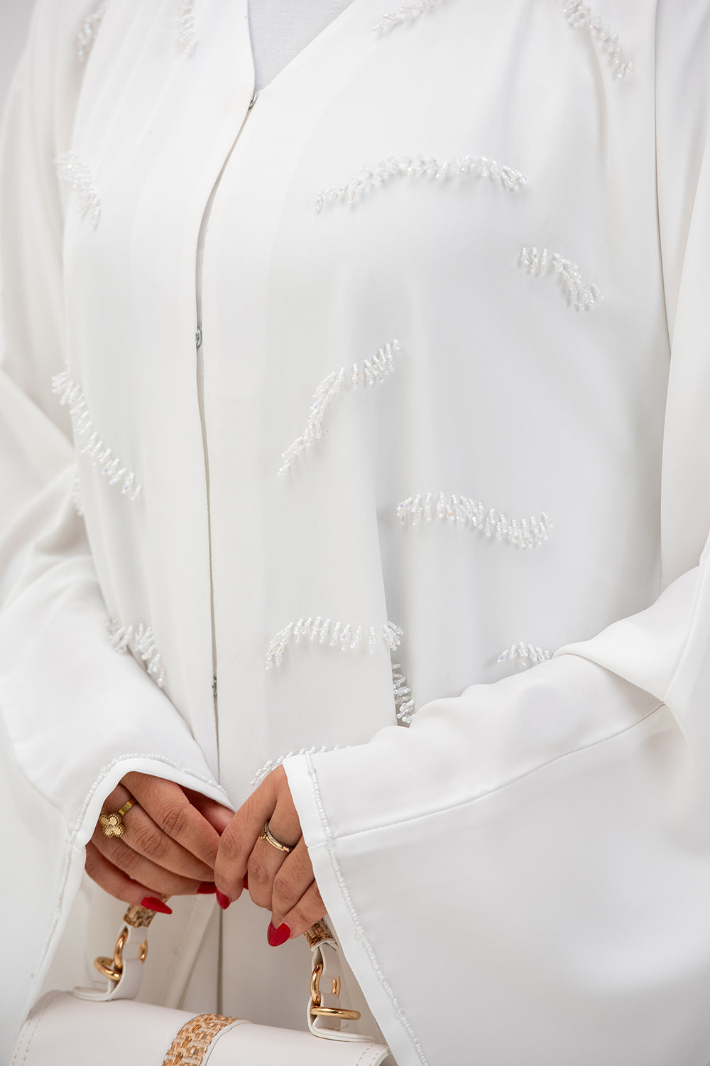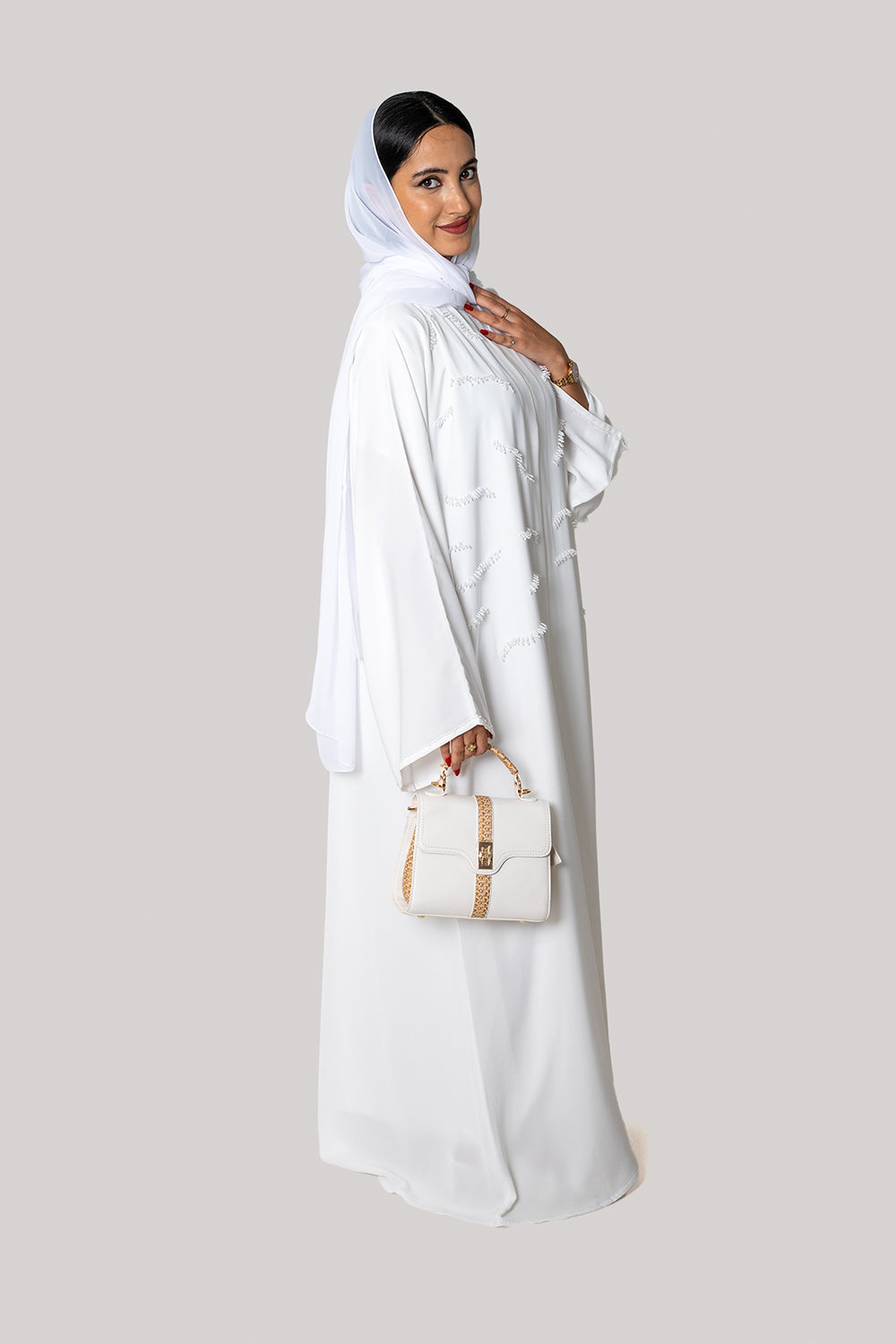 This beautifully hand made abaya is an eye catching piece. The luxurious soft fabric in white color will make you feel like royalty.