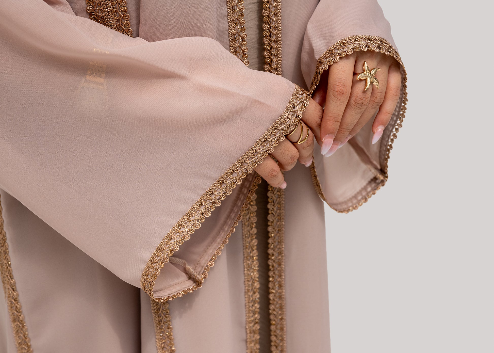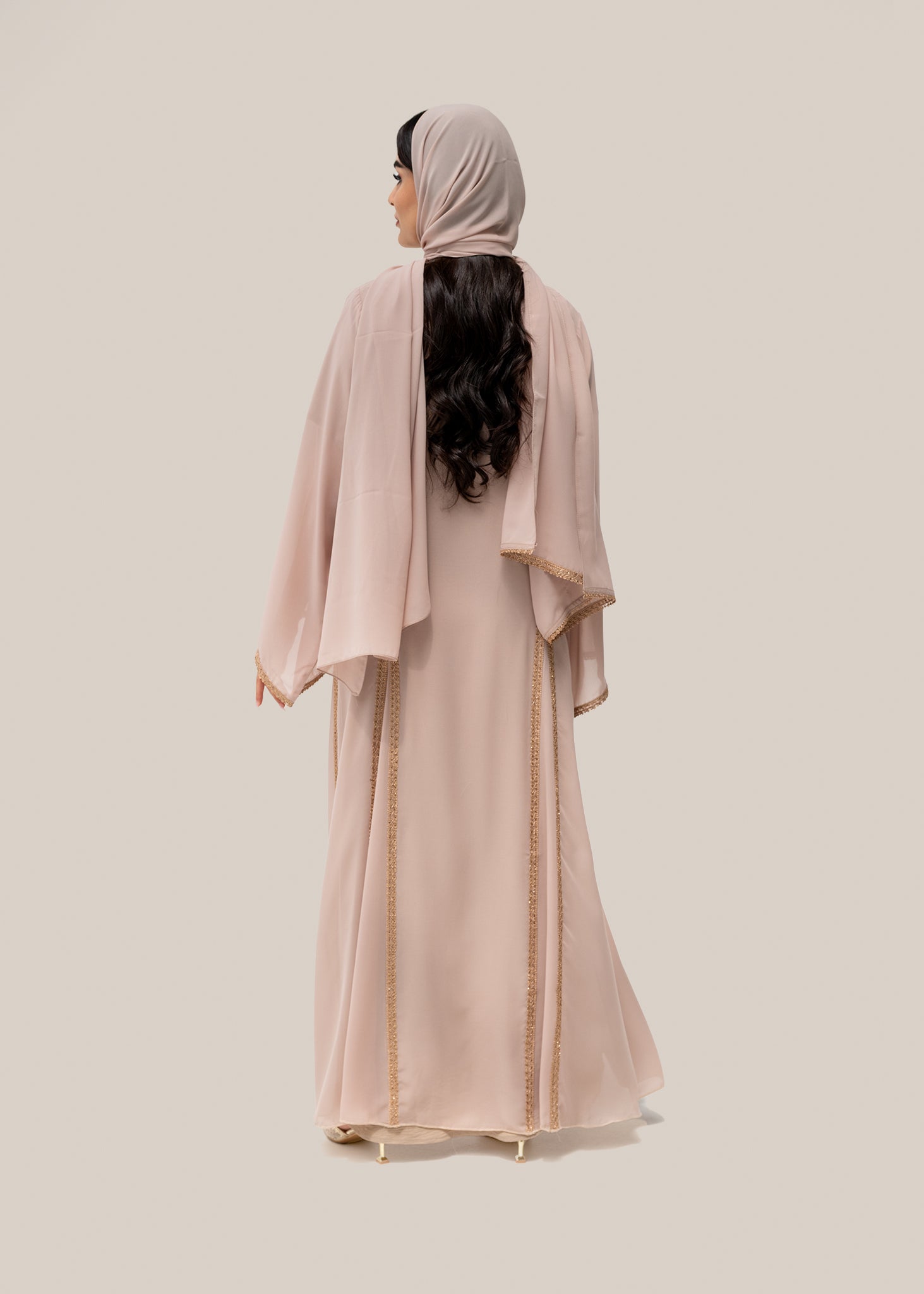 A beautifully refined abaya adorned with intricate lace detailing that frames the silhouette with subtle sophistication. The soft fabric drapes beautifully, while the gold-toned lace adds a timeless touch of luxury