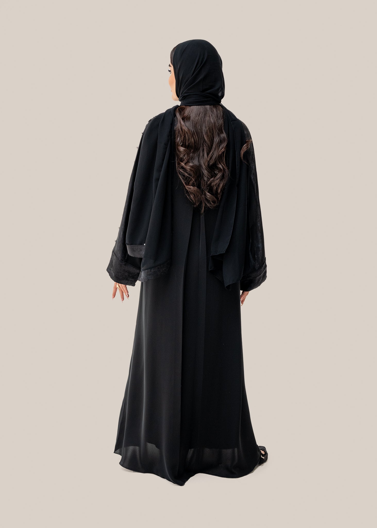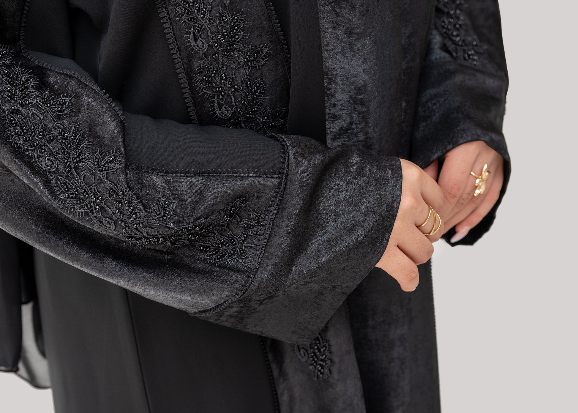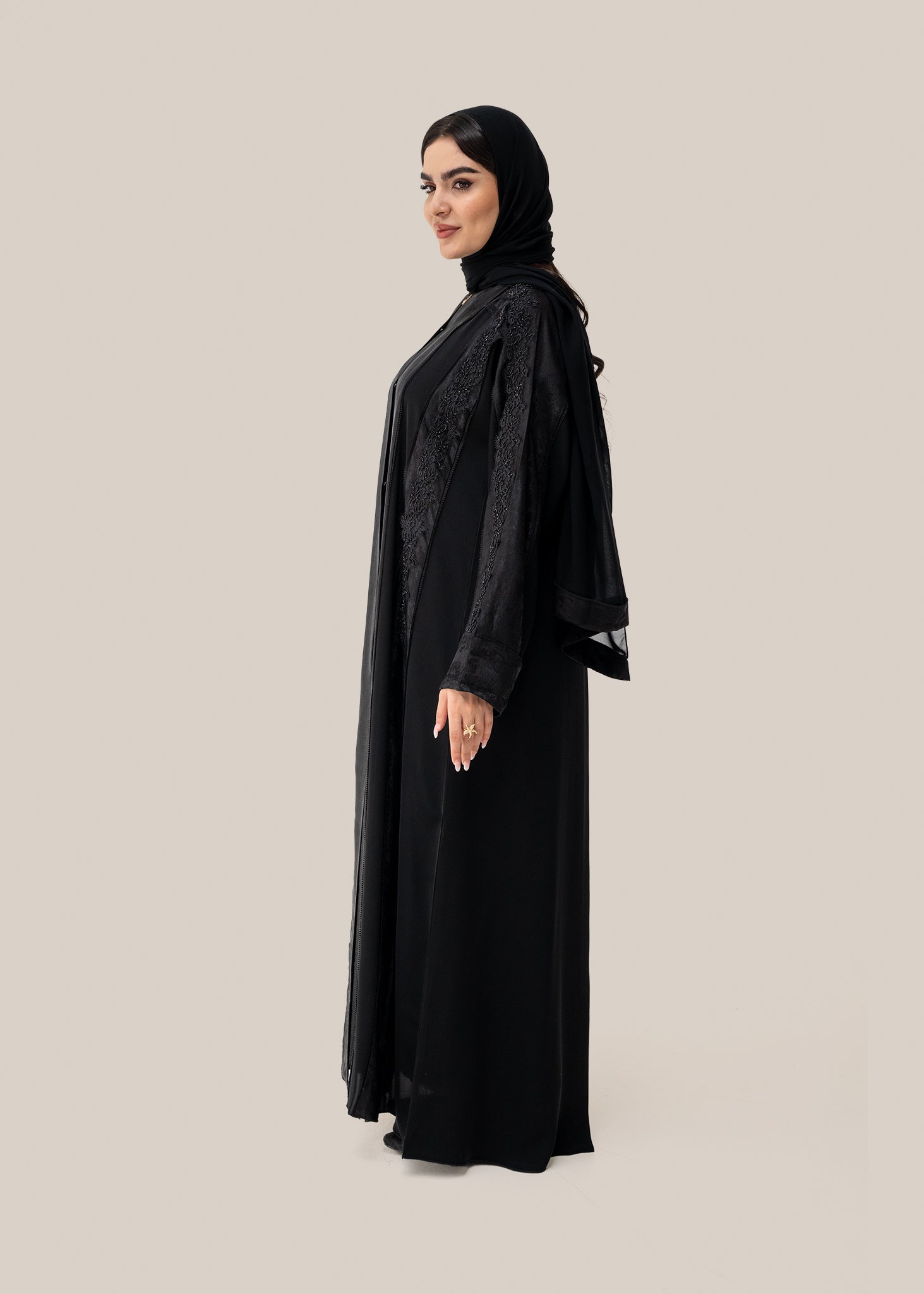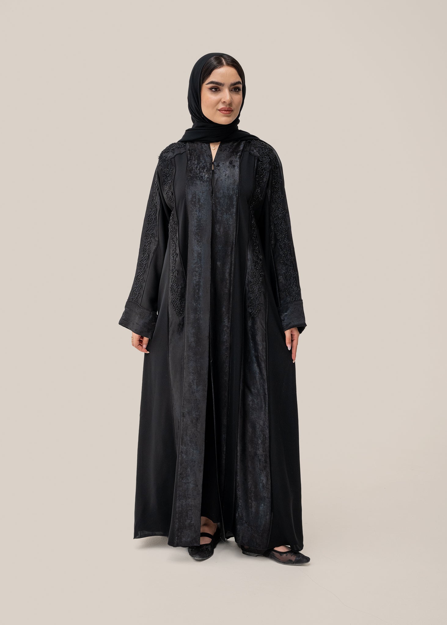 A timeless black abaya elevated with artisanal lace work , this piece blends textured fabric panels with hand-finished lace details for a sophisticated, modern finish. Ideal for women who appreciate subtle elegance with a touch of craftsmanship.