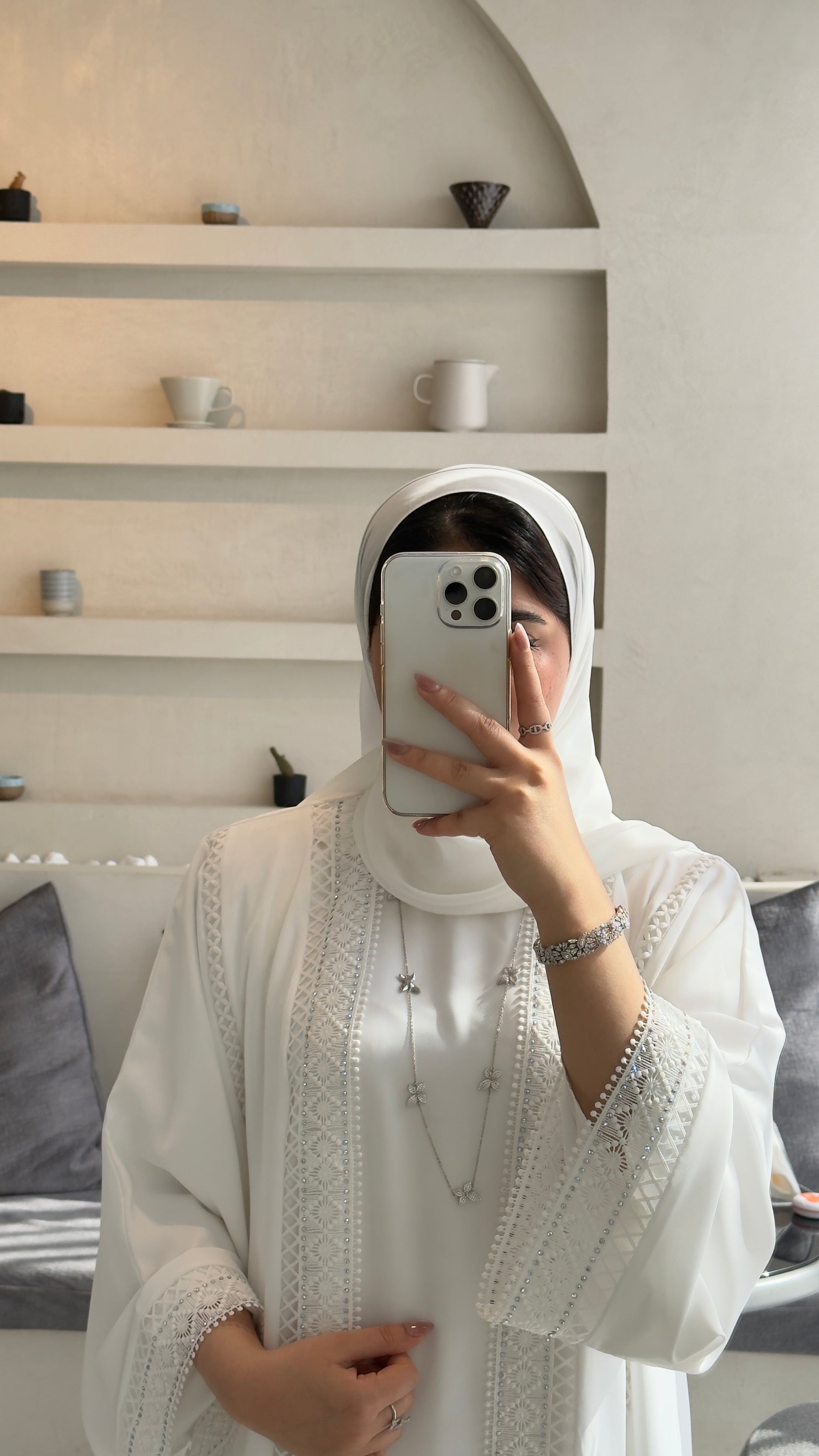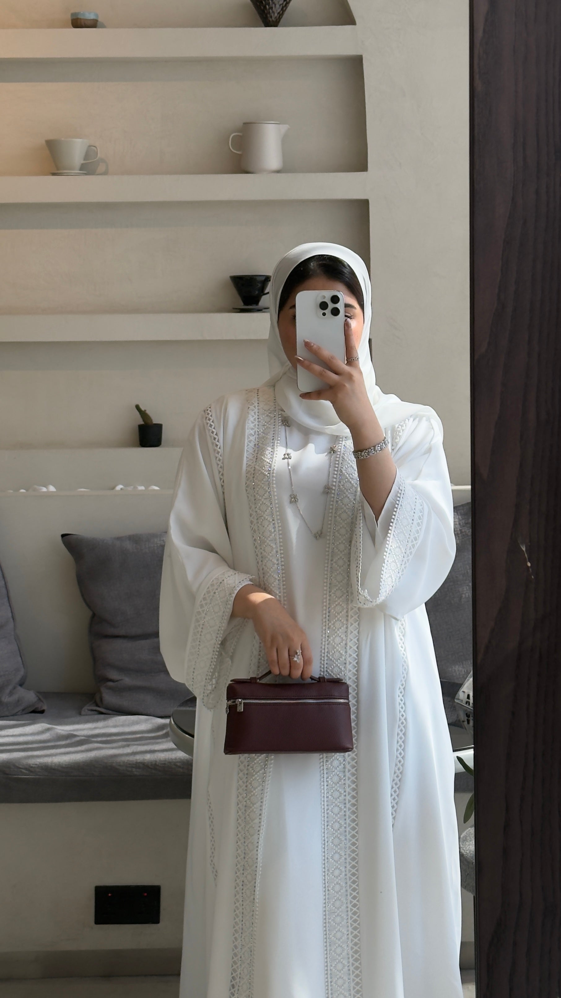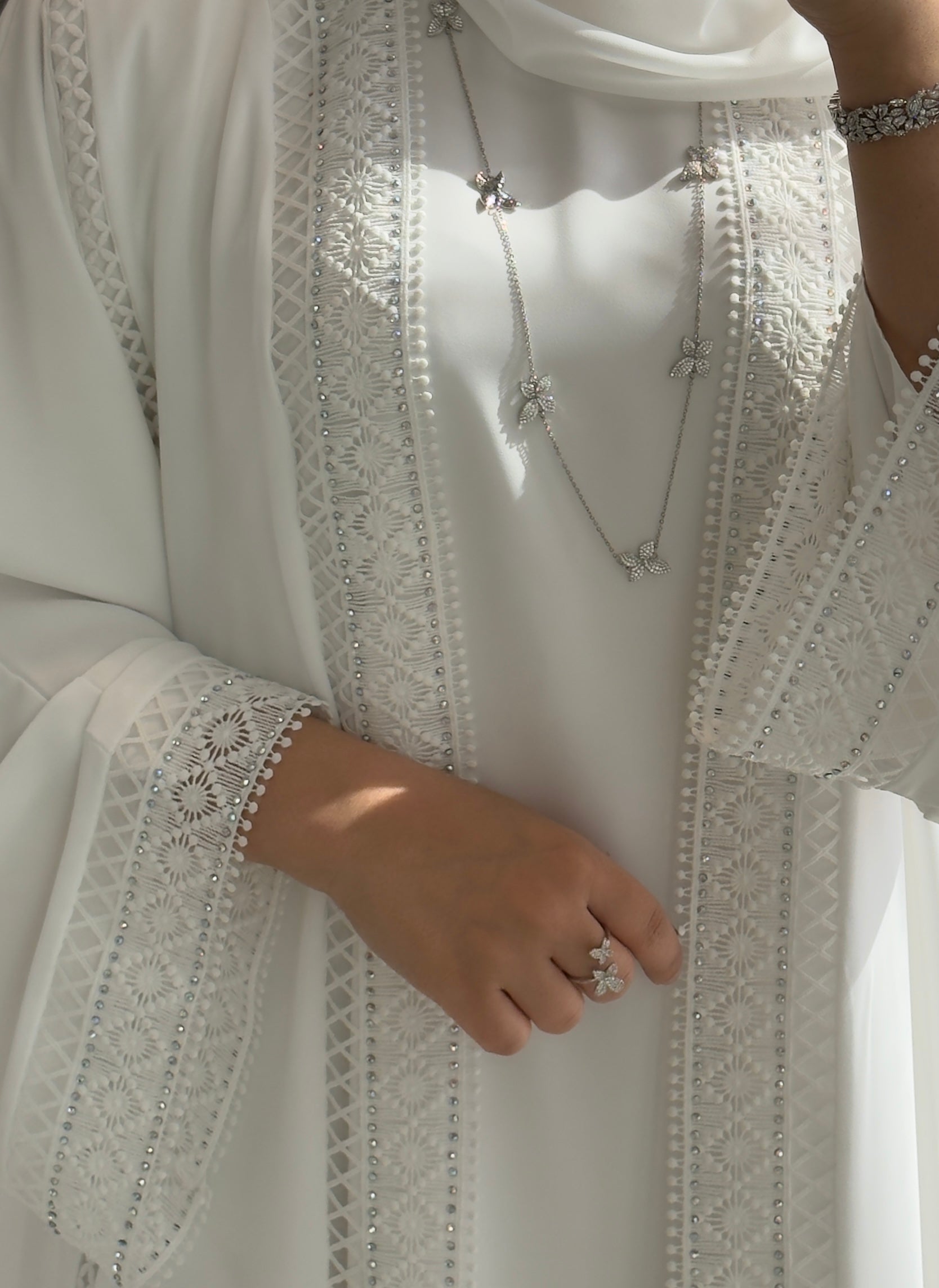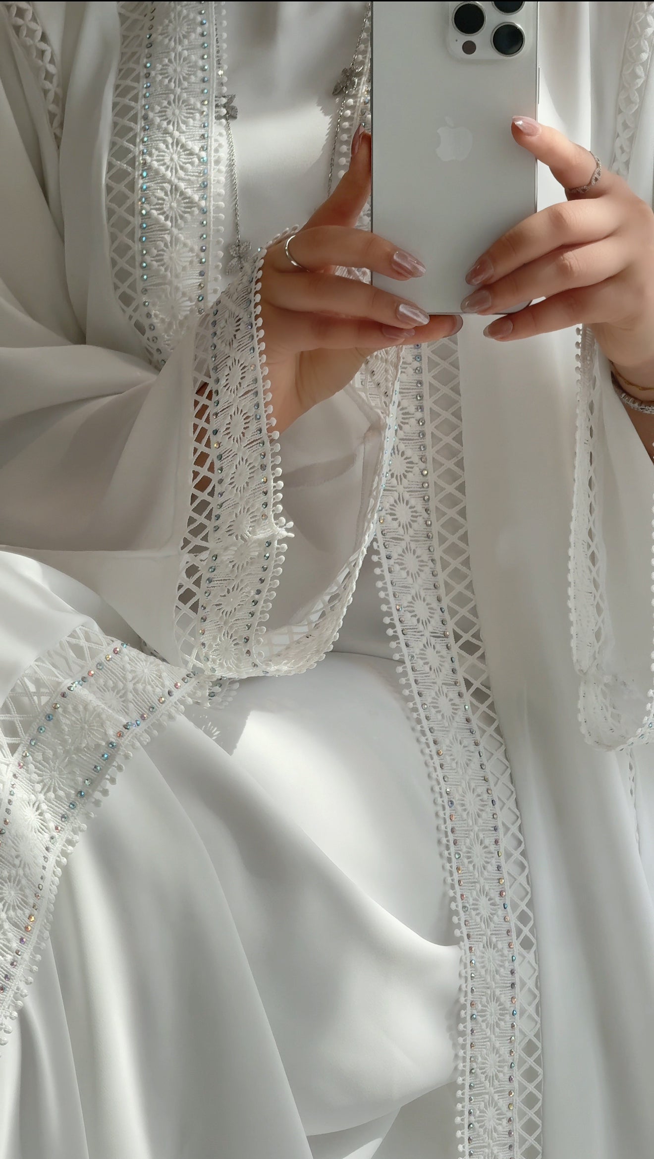 A beautifully crafted white abaya designed with fine lace trims that add texture and sophistication. The clean design and airy drape make it an ideal choice for women who appreciate understated luxury with a modern touch.