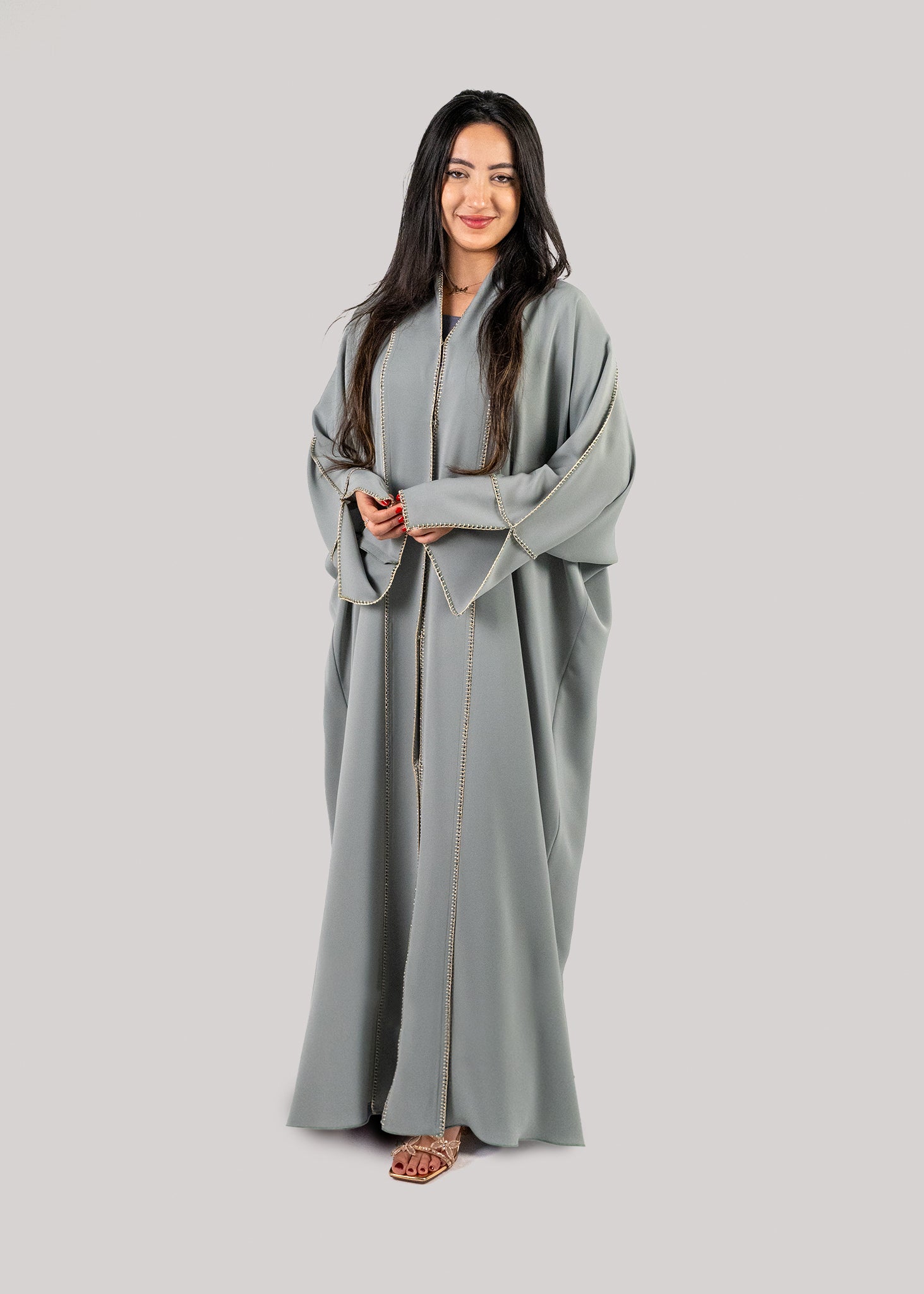 This stunning handmade Khureshi work abaya is a masterpiece. It combines traditional bisht style with elegant embellishments. A truly grand choice for any special occasion.