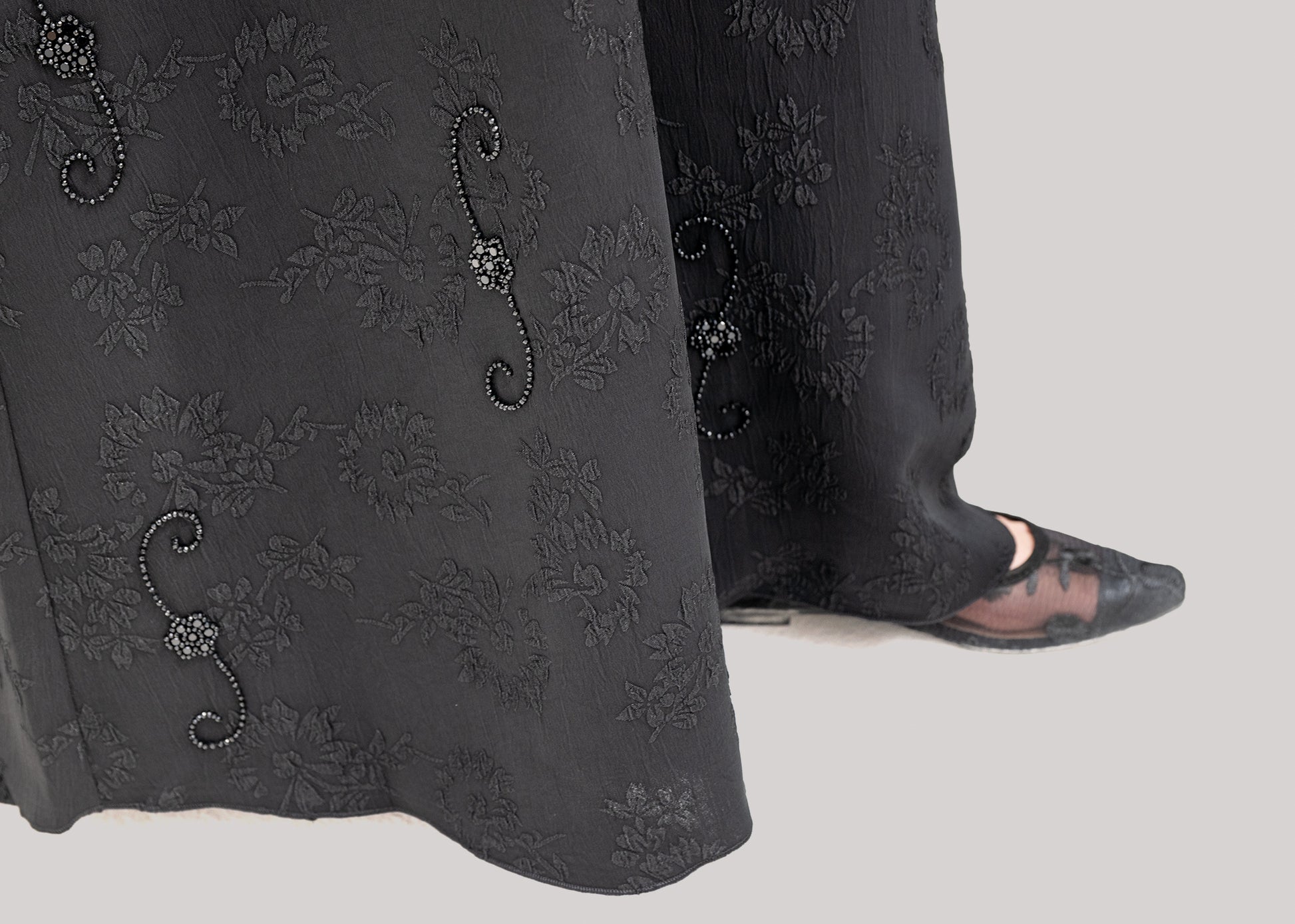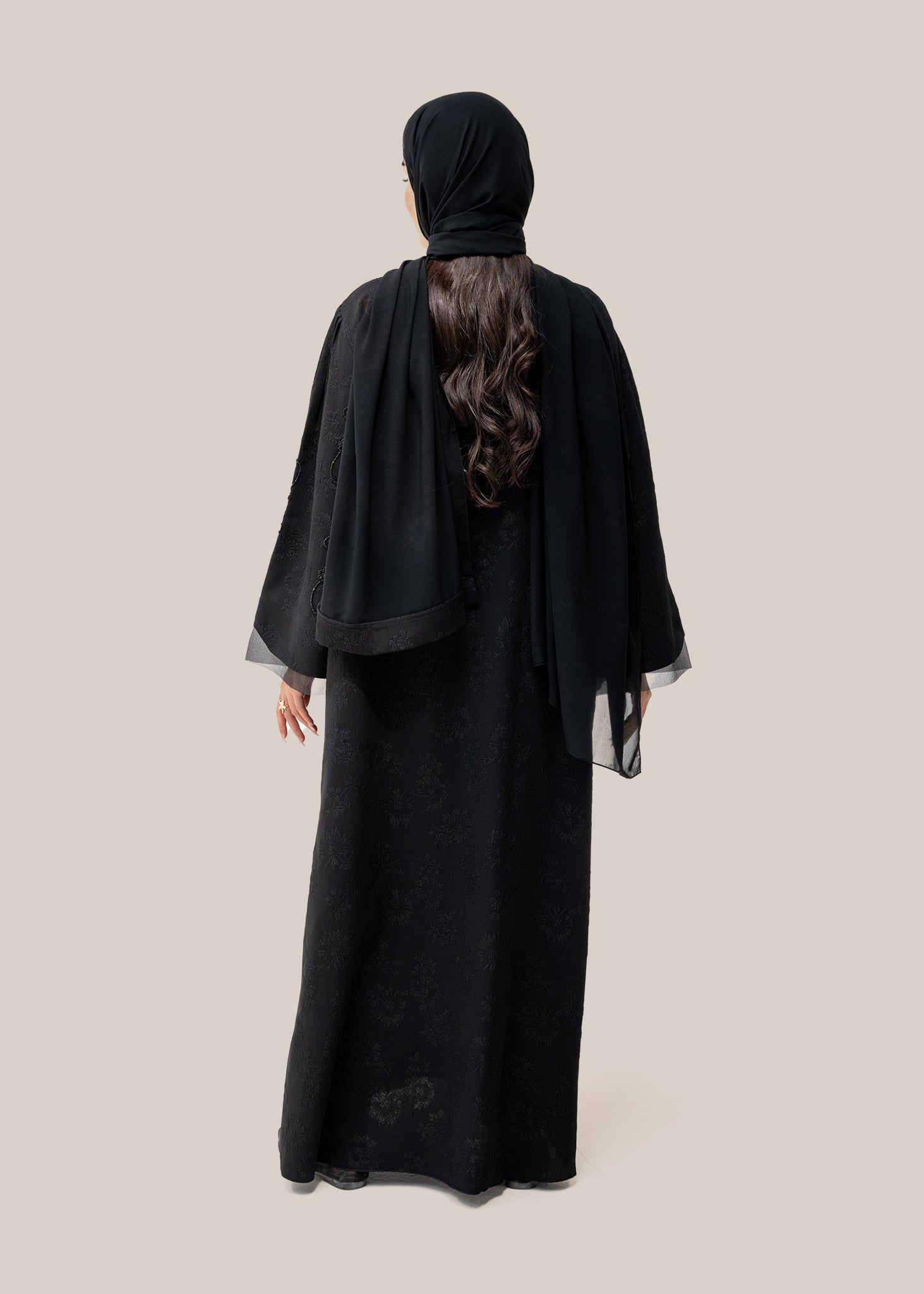 A graceful blend of woven texture and artisanal charm , this abaya showcases fine handwork carefully stitched across the fabric, creating a soft, sophisticated pattern. Perfect for women who appreciate understated craftsmanship with a luxurious feel.