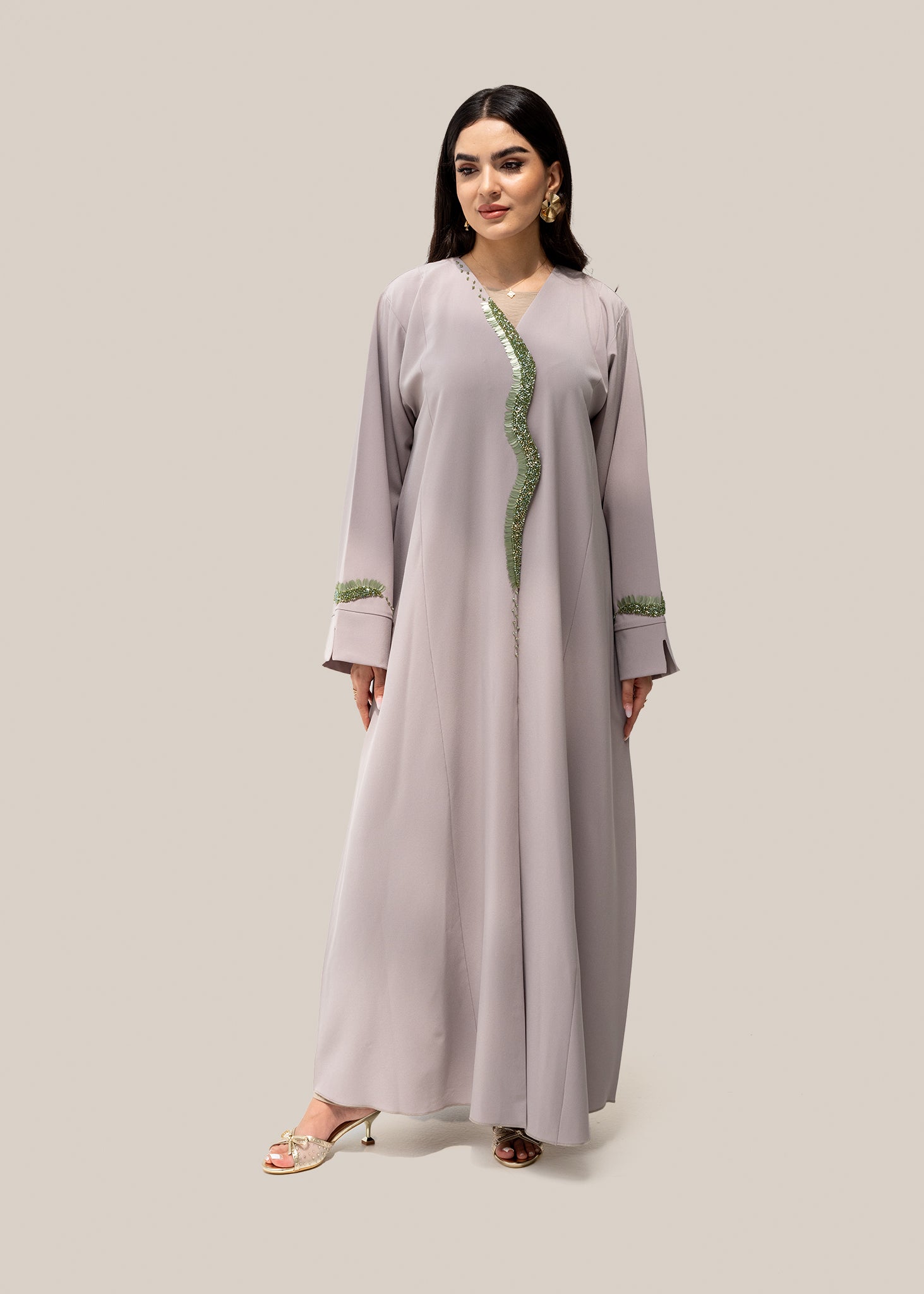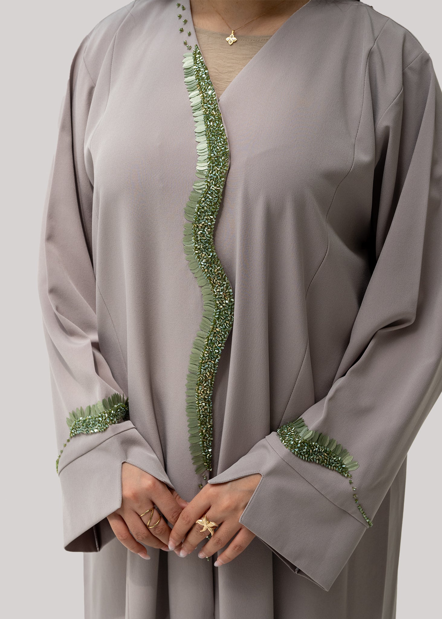 Make a subtle yet striking statement with this pastel abaya adorned with delicate green handmade embroidery. Its lightweight drape and artisanal detailing create the perfect blend of elegance and comfort for everyday wear or special occasions