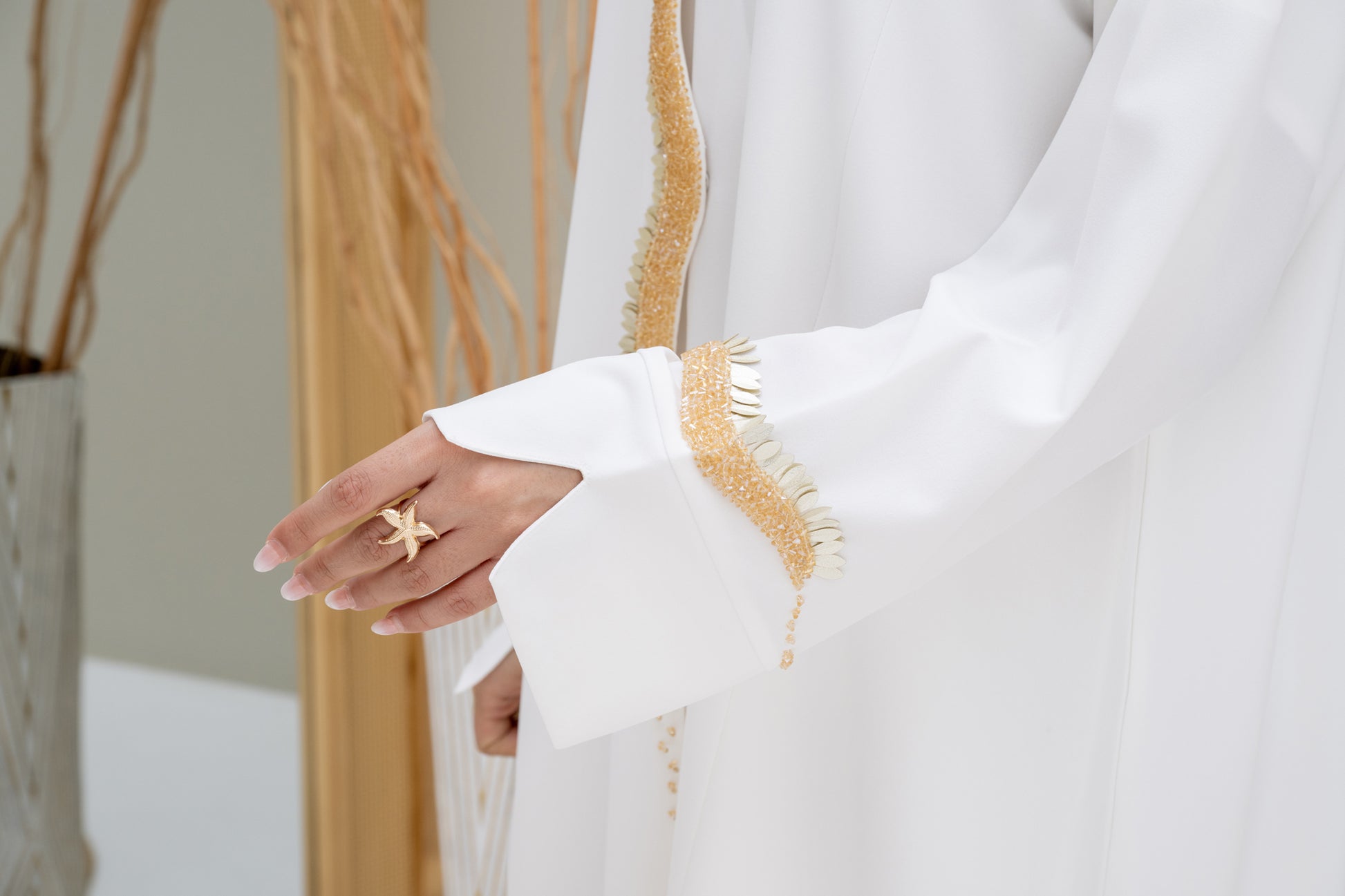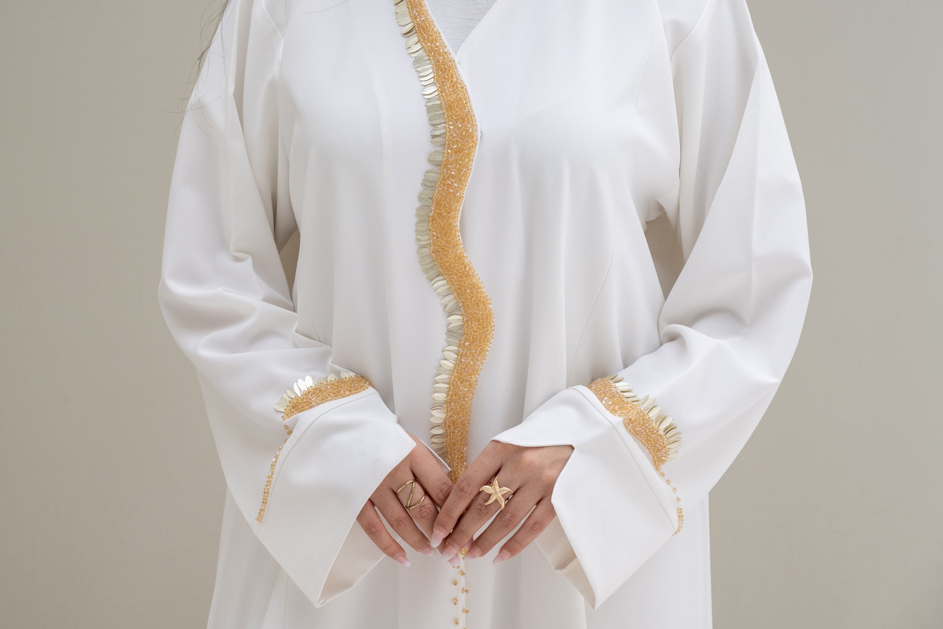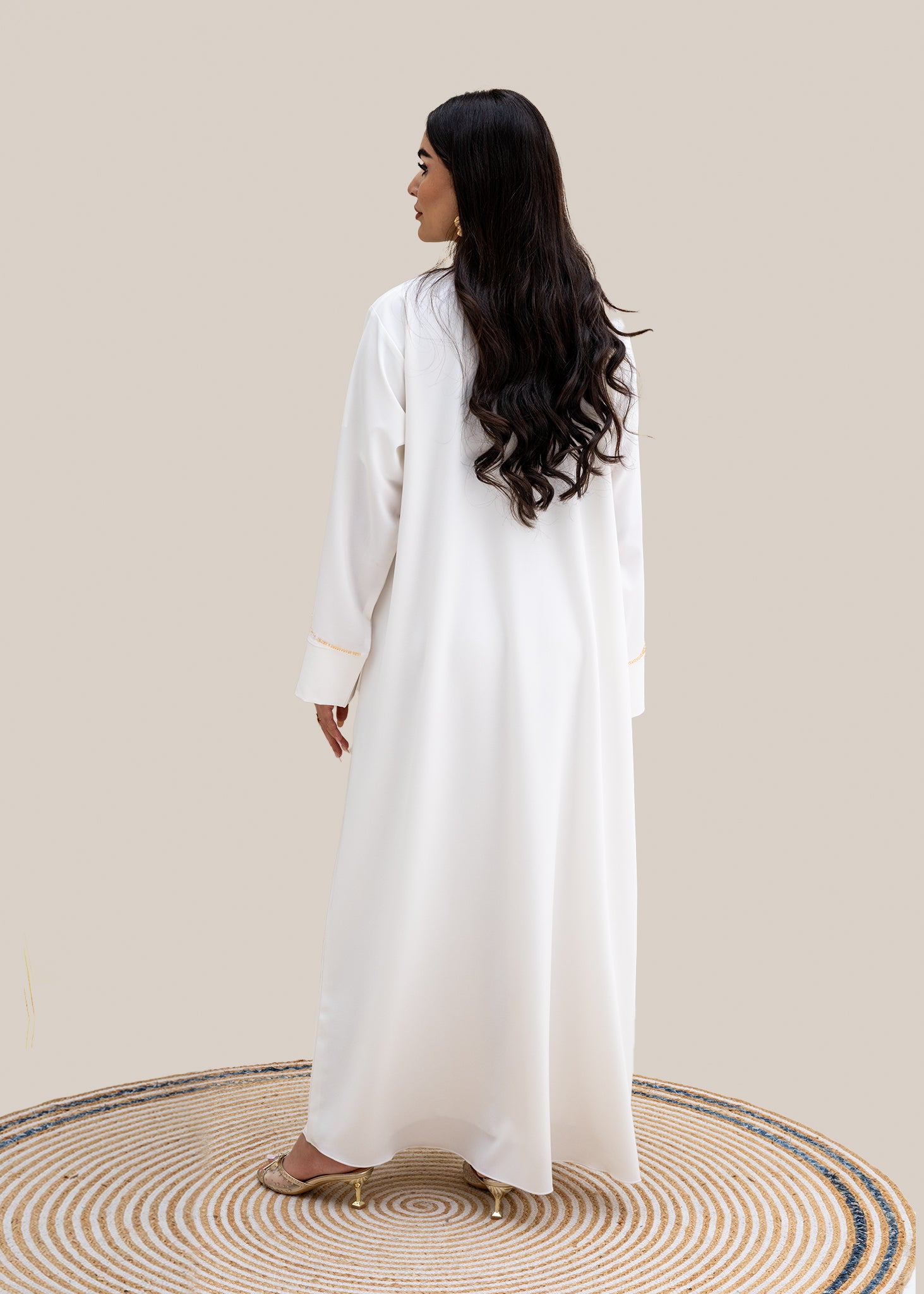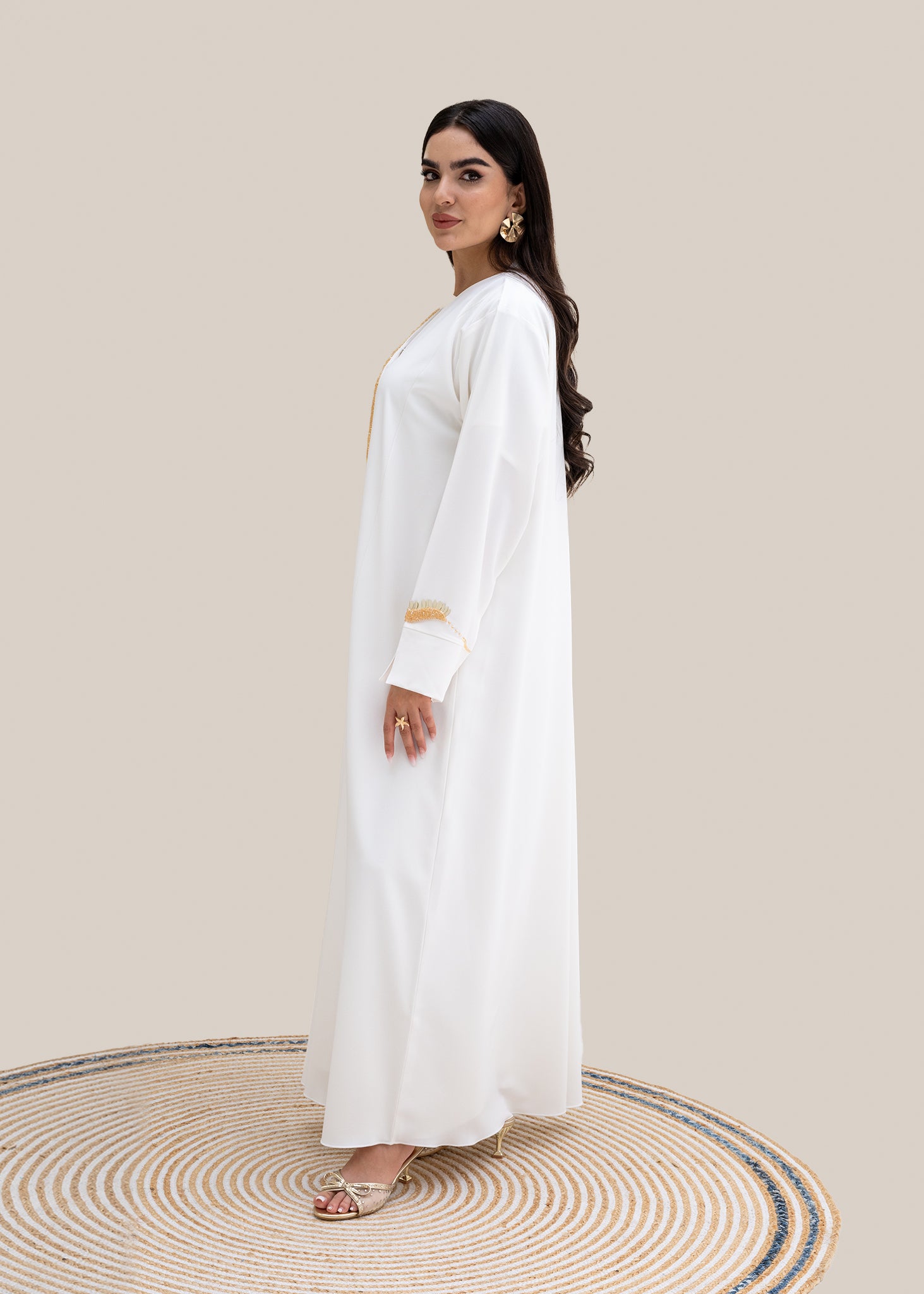Step into refined style with this handcrafted abaya adorned with a distinctive gold-thread motif along the front and sleeves. Its soft drape and artisanal finish make it the perfect blend of elegance, craftsmanship, and contemporary charm.